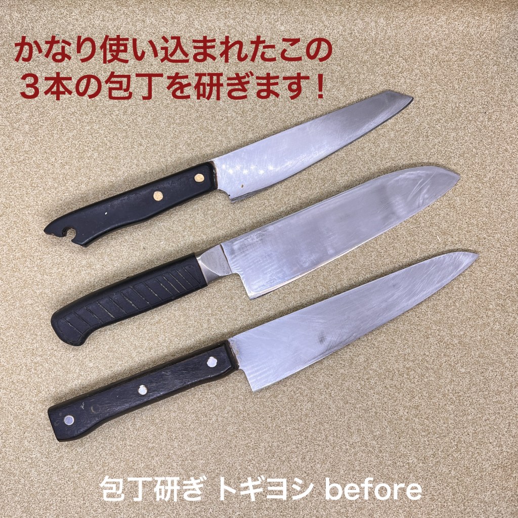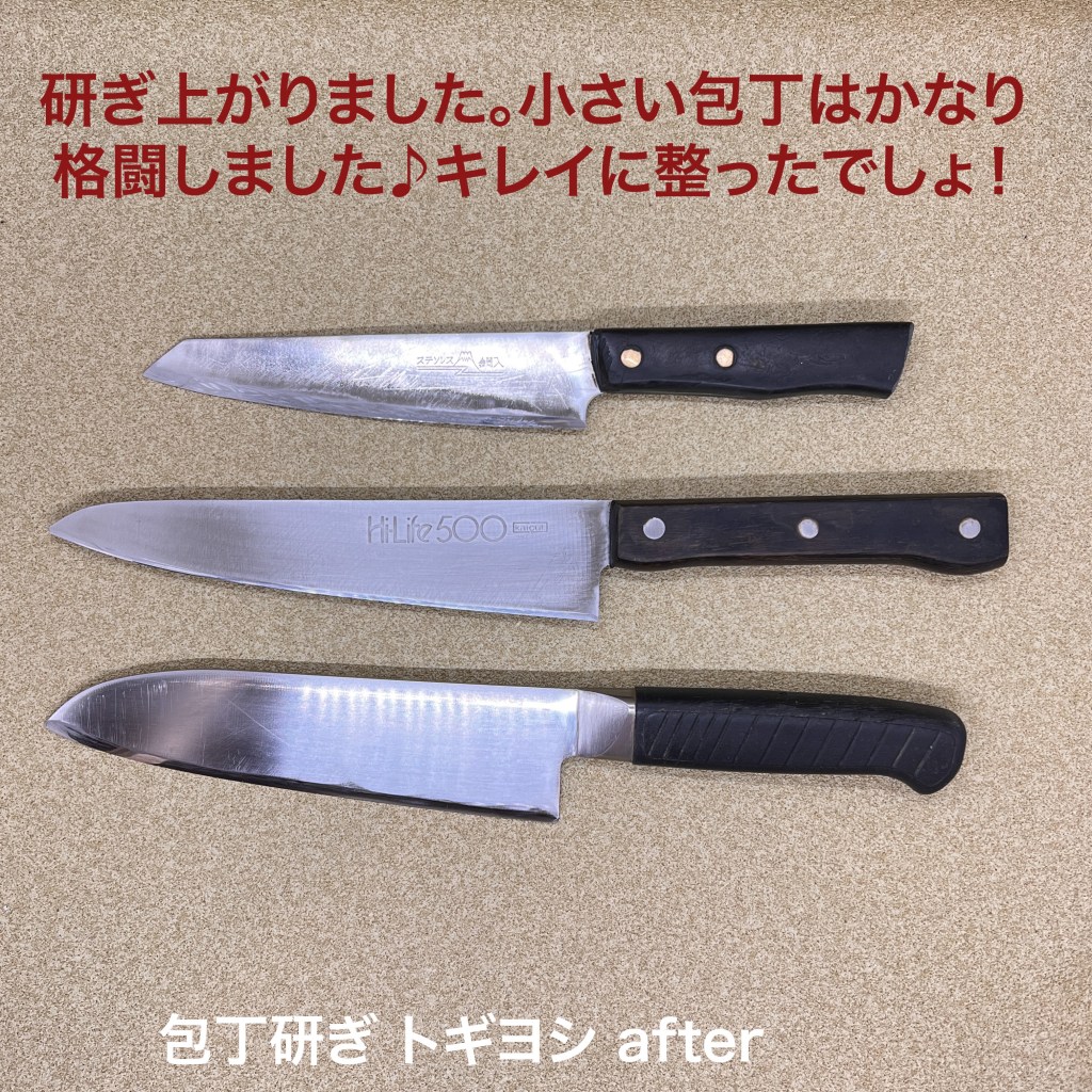 トギヨシの木元です。今日はこの3本を研ぎ上げました。かなり使い込まれた包丁たち、特に1番小さな包丁は柄の端が折れているのと、癖の強い研ぎ方になっていますし刃身がかなり厚くなってましたので1番研磨量が多くなりました。芯が鋼入りなので仕上がりは最高でした。HILIFEの牛刀も癖の強い研ぎ方になっていましたので刃先を整えて仕上がりました。三徳包丁は傷みが少なかったのですが、材質のせいなのか、腕のせいなのかなかなかカエリが落ちず迷走しましたが無事仕上がりました。包丁研ぎのご依頼をお待ちしています。