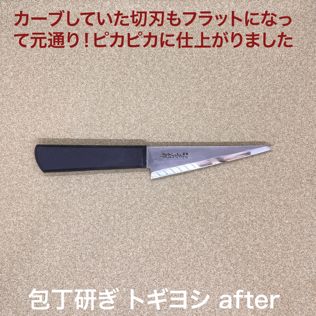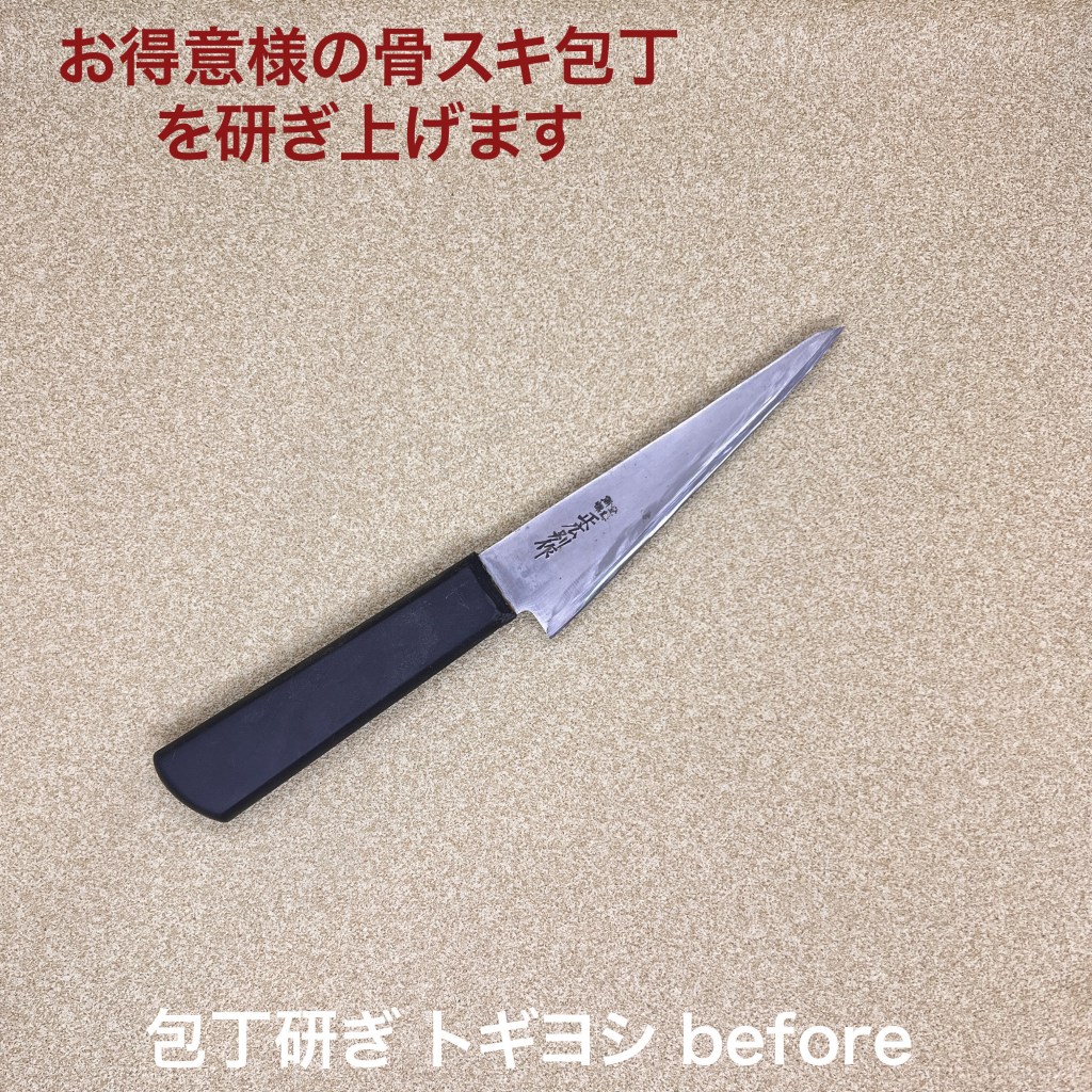 トギヨシの木元です。今日はこの1本を研ぎ上げました。 お得意様の正広の骨スキ包丁。ご自身で研がれると刃先だけ落としてしまいます。切刃全体を研がないと片刃の研ぎにはなりません。一旦刃先を荒砥で一定の角度にリセットしてから仕上げました。なかなかの作業量になるんですよ。