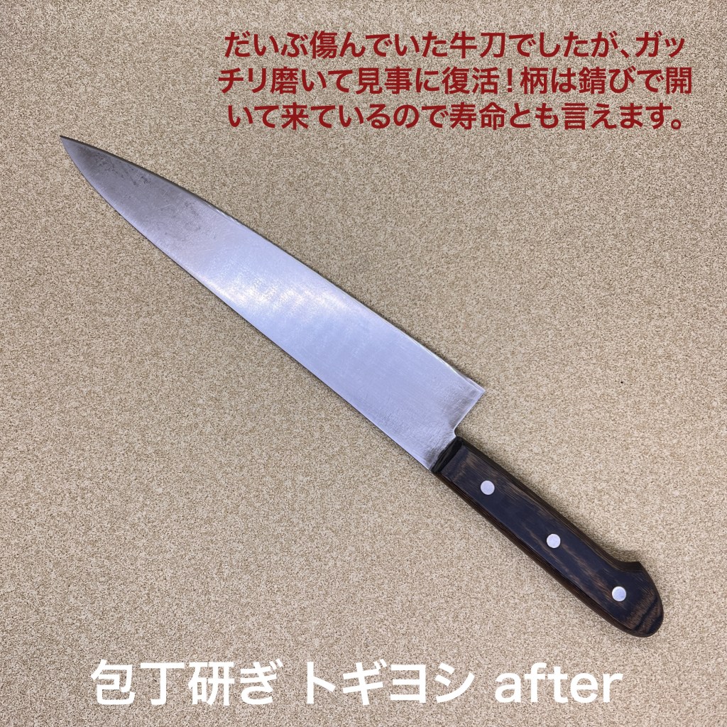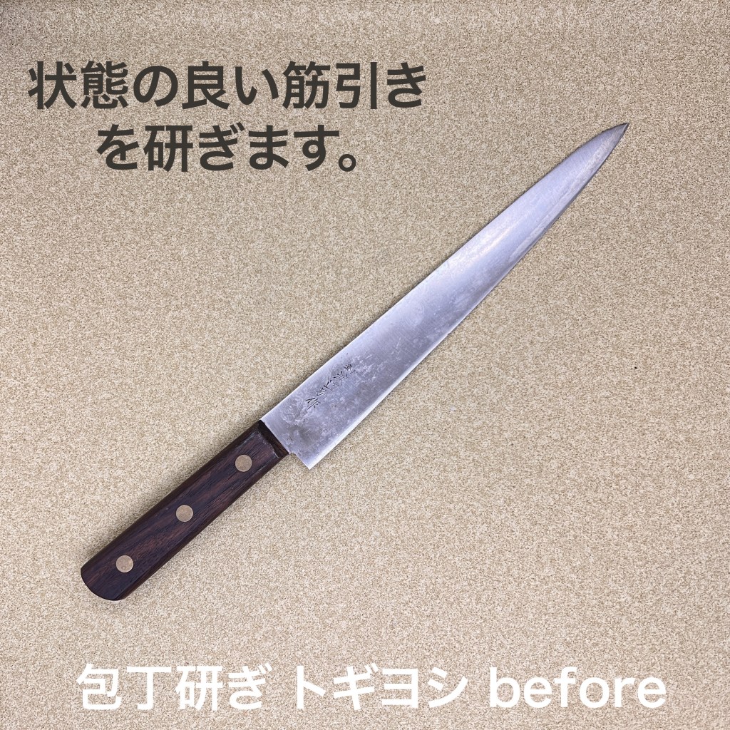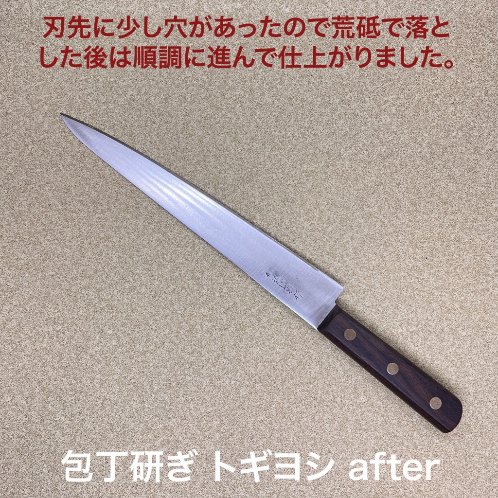 今日はこの2本を研ぎ上げました。初めて研ぎをご依頼いただきました。今日は筋引きと牛刀を研ぎ上げました。牛刀はサビが浮いていましたが刃先には影響はなくガンガン磨いて傷をできるだけ消しています。研ぎの方は特に問題は起きず順調に仕上がりました。筋引きは刃先が少し荒れていたので荒砥で落として仕上げました。
