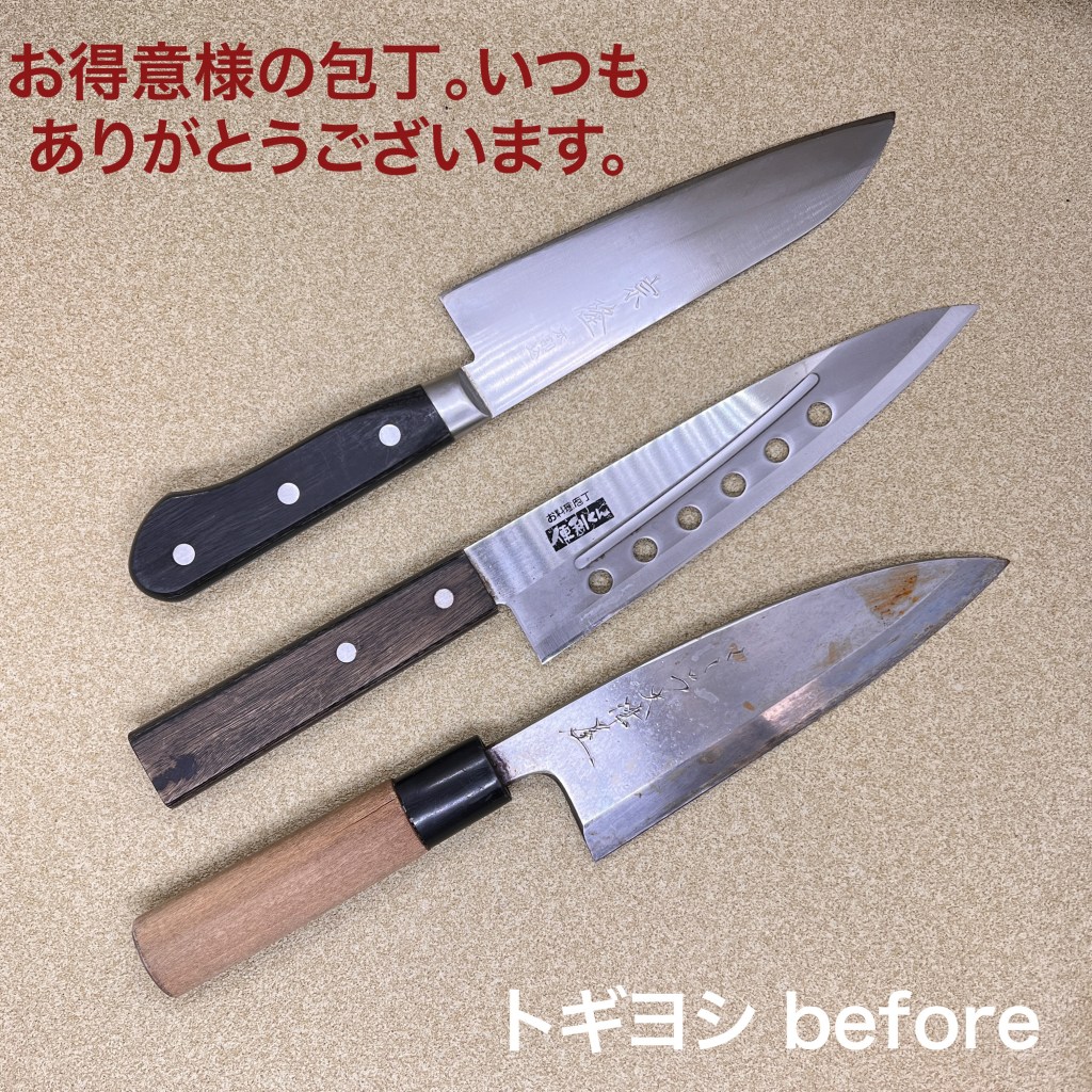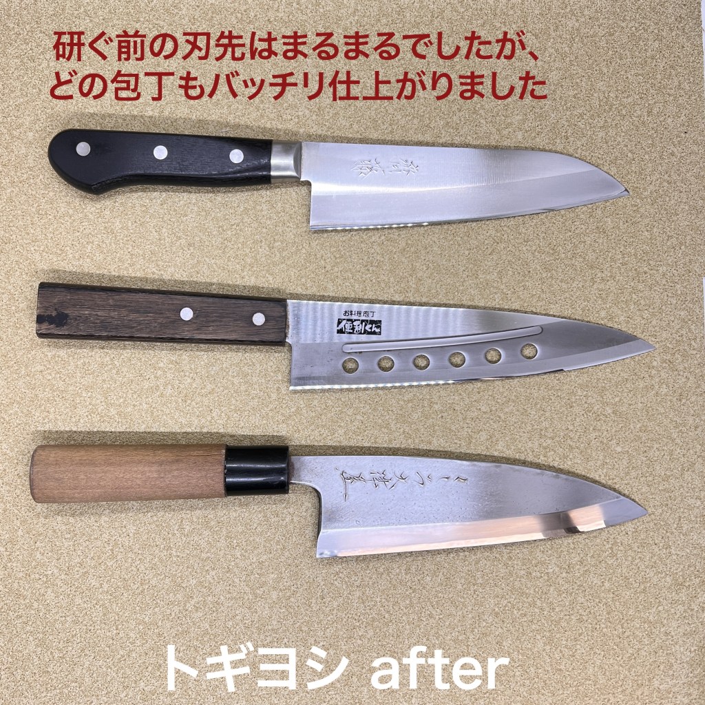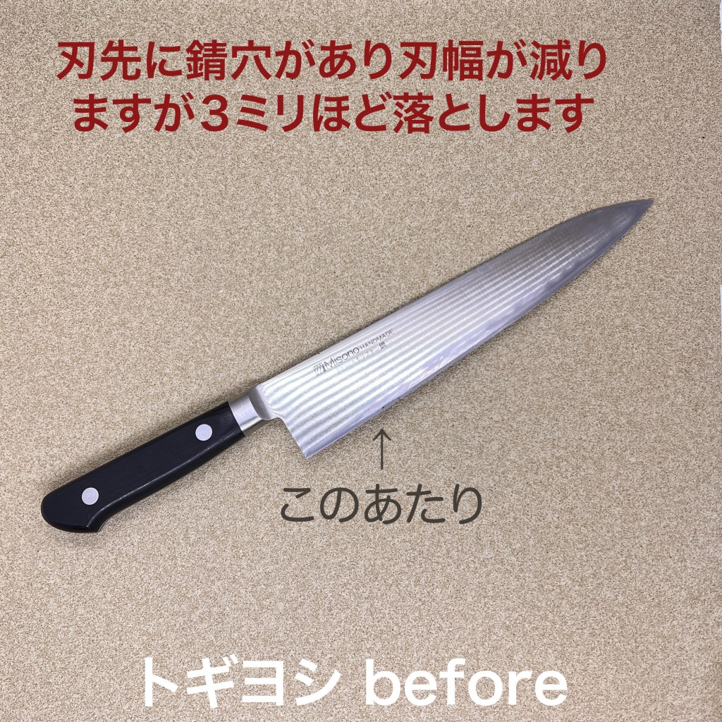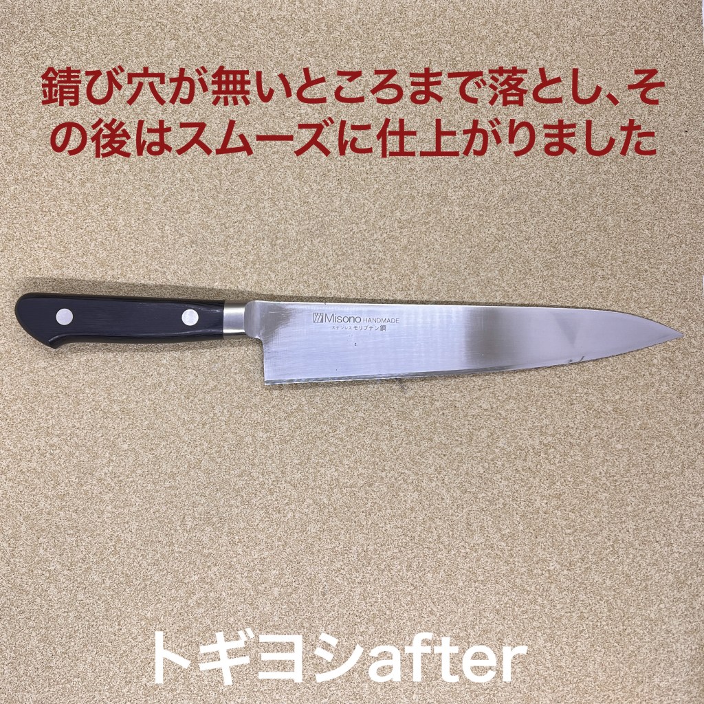今日はこの4本を研ぎ上げました。3本はお得意様の包丁。いつもありがとうございます。何度も研いでいますので自分の形になっていますのでスムーズに研ぎ上がりました。出刃包丁も錆びは無く丁寧に使われているのが判ります。ミソノの牛刀は手前から3センチくらいの刃先に錆び穴が数カ所ありしかも深いため落とすしかありませんとお伝えして刃先を3ミリほど落としました。それ以外は問題なくスムーズに仕上がりました。