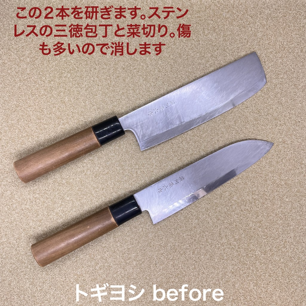 今日はこの2本を研ぎ上げました。お得意様の濃州孫六の包丁。菜切りも三徳包丁も傷だらけでしたので懸命に磨いて最後は1000番で梨地風に。刃先は菜切りが緩くカーブしていてまな板に点でしか接触しないのでフラットな部分を増やして仕上げました。これできゅうりを輪切りしても繋がらないかなと思います。