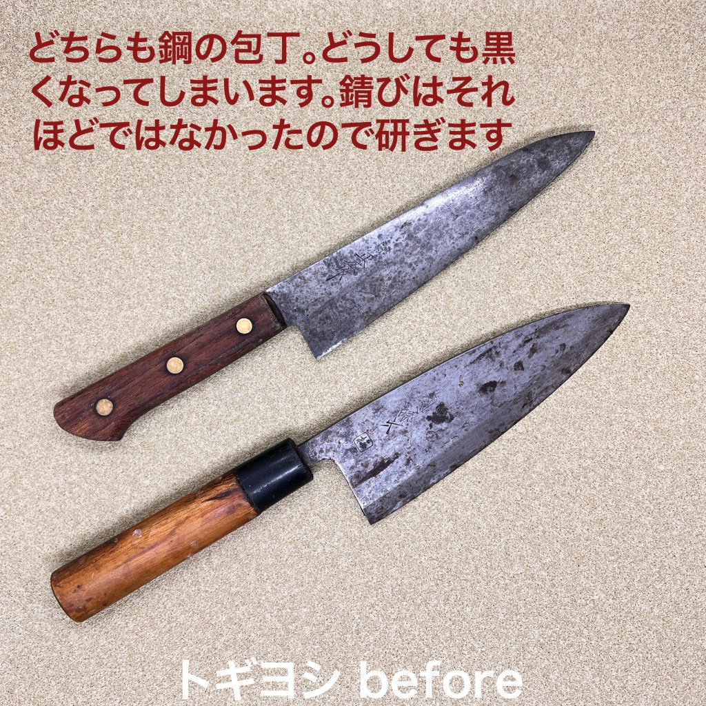 この2本を研ぎ上げました。すっかり黒ずんだ牛刀と出刃。赤錆が刃先になかったので大丈夫と判断。でもどちらも刃先は荒れていて出刃は0.5から1ミリほど落としました。両方とも仕上げの段階で刃先に荒れが残っているのが判明。刃先を落としてから中砥に戻ってやり直しました。部屋の温度も高いから多汗かきました。風呂入ろっと。