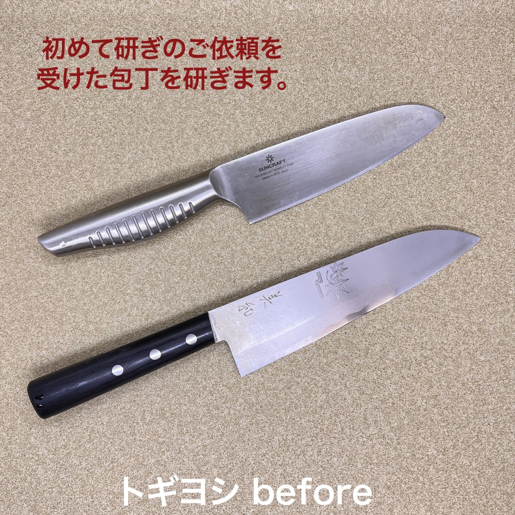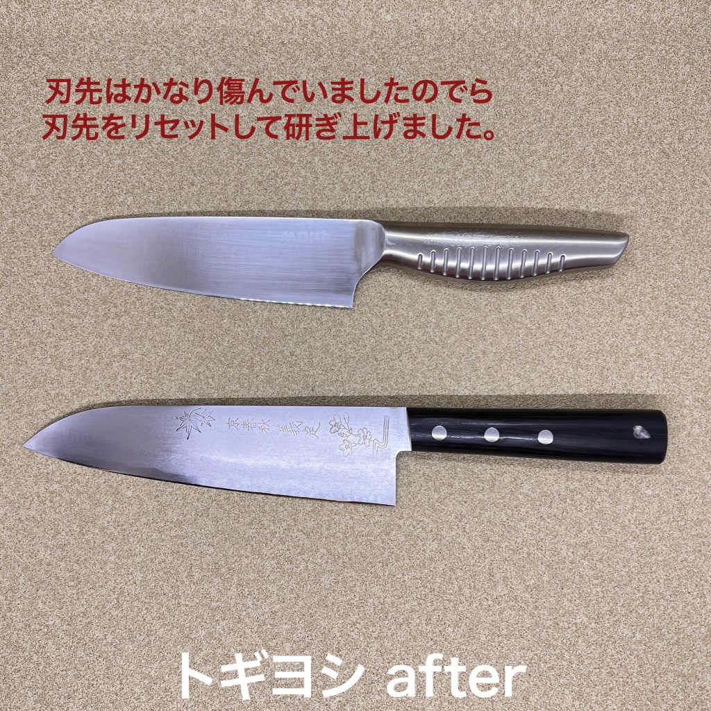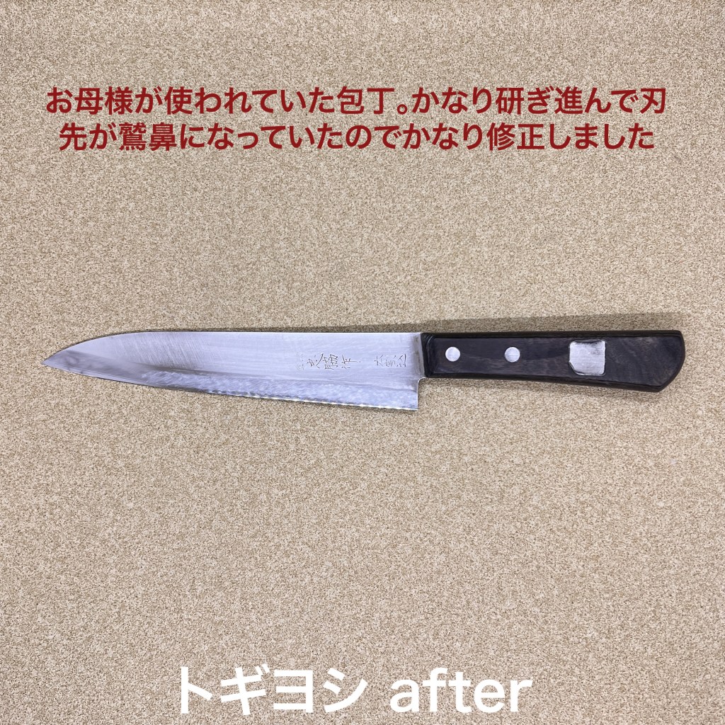 この3本を研ぎ上げました。義定の三徳包丁は京都修学旅行のお土産紅葉の刻印がかわいいですね。刃先の傷みはそこそこ。初研ぎなので大きな修正は無くスムーズに研ぎ上がりました。小ぶりな三徳包丁はカワカミモトミデザインの包丁。こちらも刃先の傷みはそこそこありましたが順調に仕上がりました。忠脇作の牛刀はお母様が使っていた包丁。なので10年以上前の包丁だと思われます。ご自身で研がれていてかなり研ぎ進んでいて、さらに刃先が鷲鼻のように真ん中が凹んでいました。beforeを撮り忘れました。刃身もかなり厚くなっていて、割り込みの鋼が見えていない状態でしたので、まずは刃身落としから始めました。しっかり割り込みの鋼が出たことを確認して研ぎ上げました。