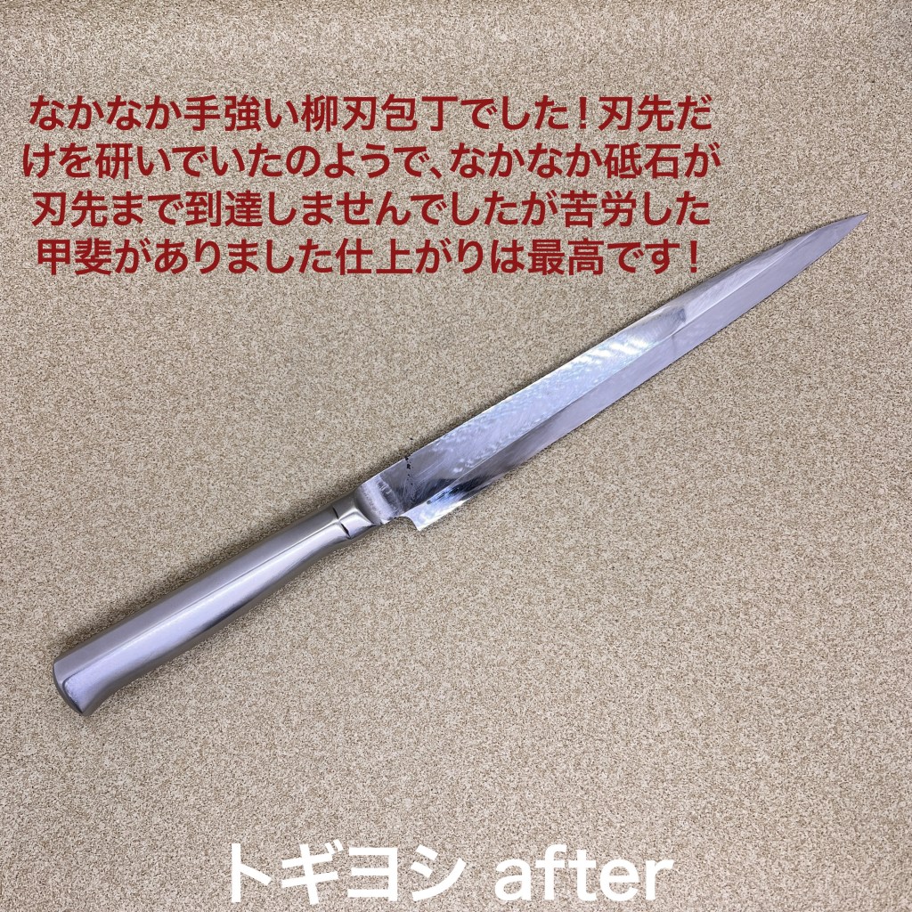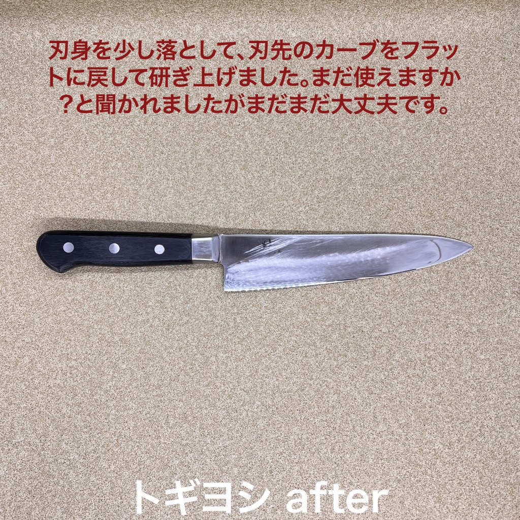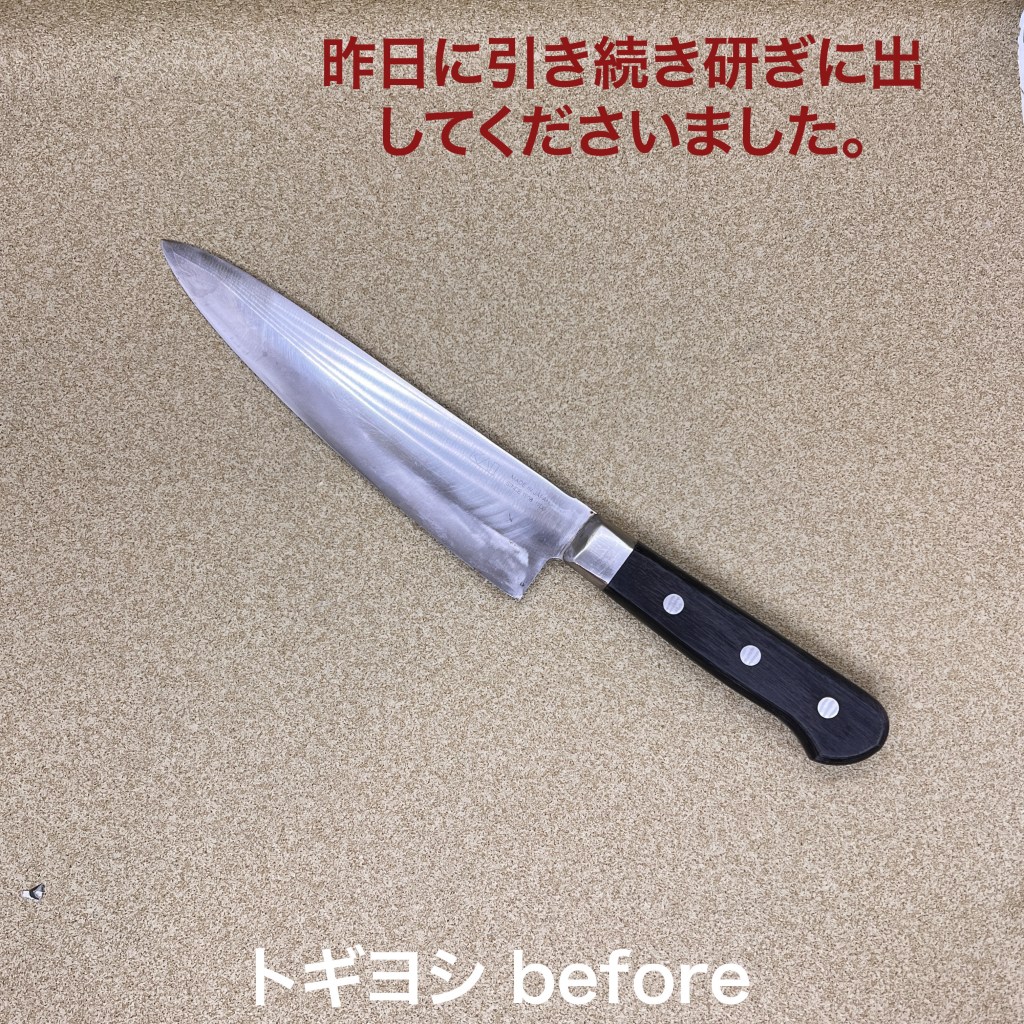 この6本を研ぎ上げました。昨日に引き続き研ぎに出してくださいました。かなり使い込まれた牛刀ですがフラットな部分が無いので刃先を削り形を整えて仕上げました。だいぶ使いやすくなったと思います。ミソノ440三徳包丁はほぼ新品ですが刃先はそこそこ傷んでいました。荒砥でリセットしてから仕上げました。3本研ぎの依頼を受けたのは中野師匠の研いでいた包丁。やっぱり研いだ部分がとても綺麗!自分もそこを目指して研鑽します。包丁の状態は刃先が少し荒れていました。ネギも潰れてしまっていたそうです。もう形が出来上がっているのでとてもスムーズ仕上がりました。ステンレスの柳刃包丁は切刃の先だけ研いだようで、なかなか刃先まで砥石が到達せず、だいぶ削りました。角度的には20度近くで仕上げています。刃の柄の近くに黒い穴が複数あり、これは錆びですと説明したら、驚いていました。錆びの侵食が進むとここから折れるかもしれません。ここは包丁スタンドが触れるところだそうです。たぶん濡れたままスタンドに差したのかもしれません。