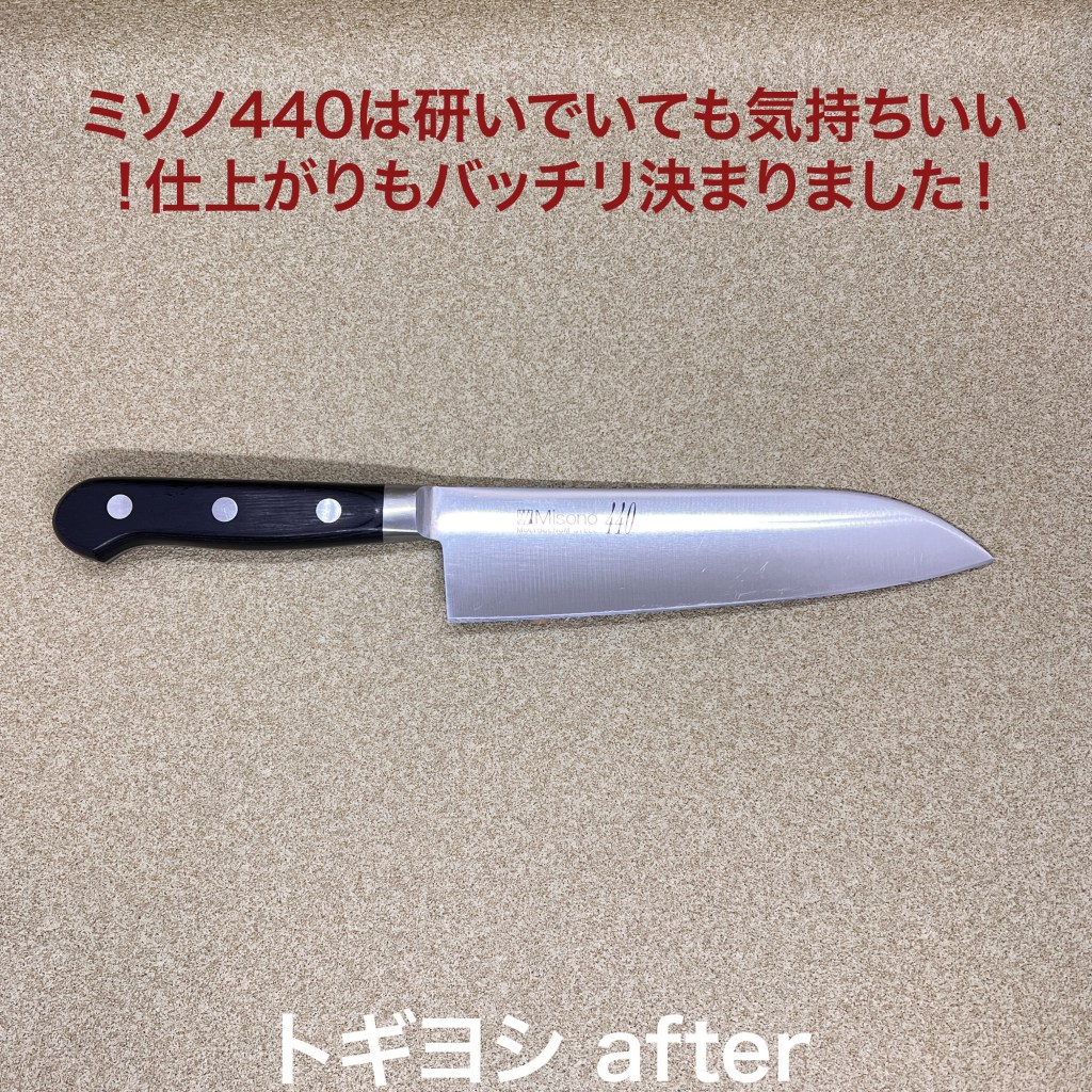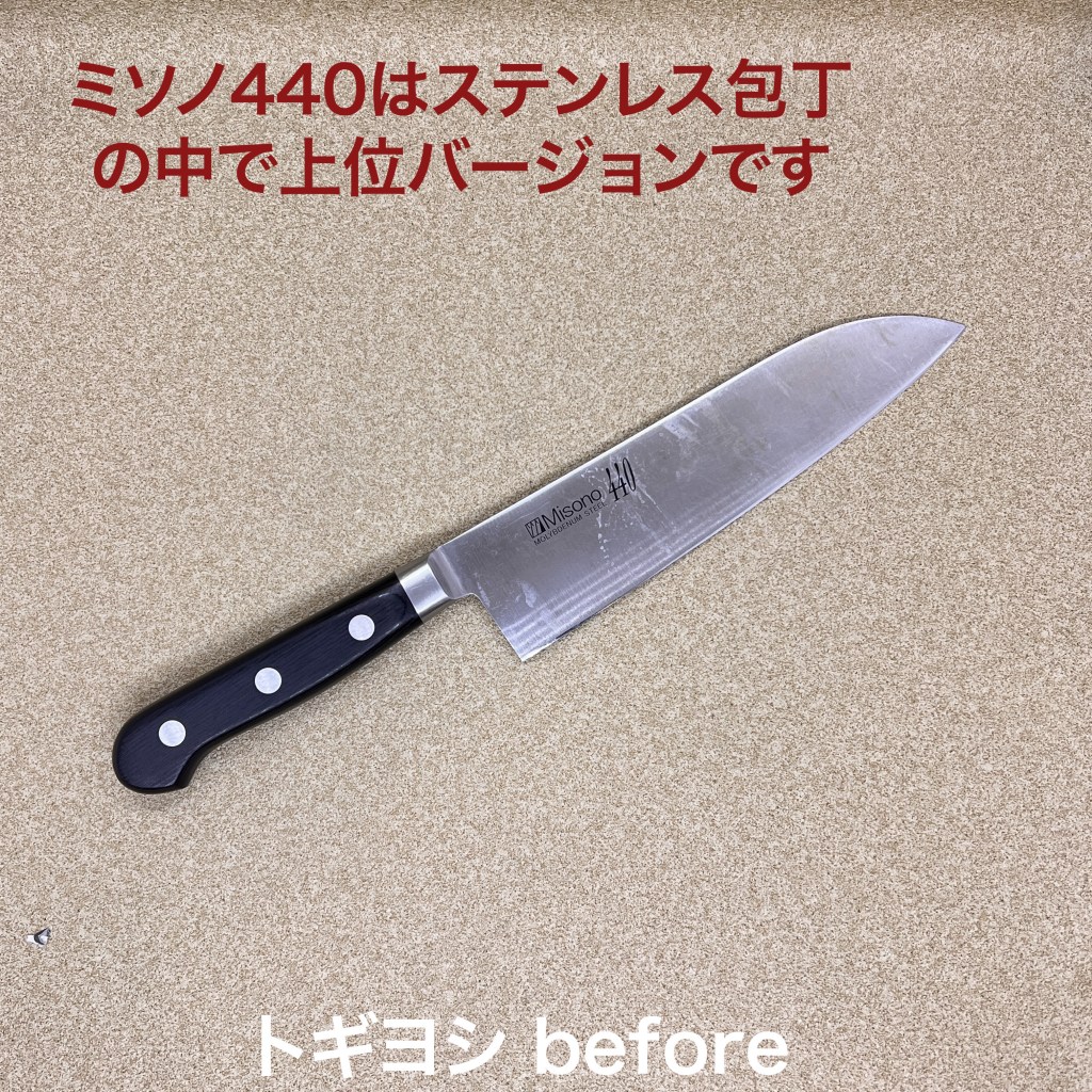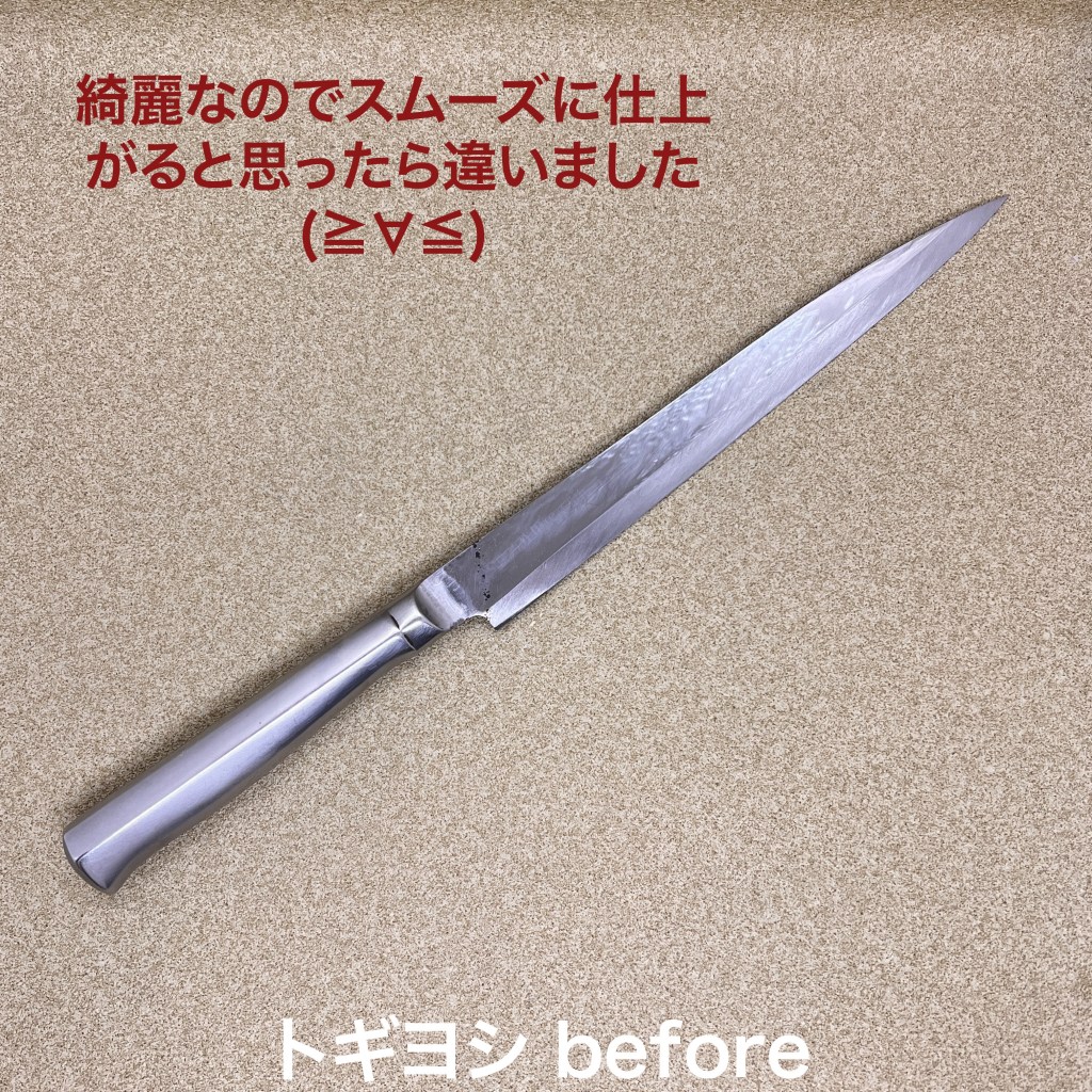 この6本を研ぎ上げました。昨日に引き続き研ぎに出してくださいました。かなり使い込まれた牛刀ですがフラットな部分が無いので刃先を削り形を整えて仕上げました。だいぶ使いやすくなったと思います。ミソノ440三徳包丁はほぼ新品ですが刃先はそこそこ傷んでいました。荒砥でリセットしてから仕上げました。3本研ぎの依頼を受けたのは中野師匠の研いでいた包丁。やっぱり研いだ部分がとても綺麗!自分もそこを目指して研鑽します。包丁の状態は刃先が少し荒れていました。ネギも潰れてしまっていたそうです。もう形が出来上がっているのでとてもスムーズ仕上がりました。ステンレスの柳刃包丁は切刃の先だけ研いだようで、なかなか刃先まで砥石が到達せず、だいぶ削りました。角度的には20度近くで仕上げています。刃の柄の近くに黒い穴が複数あり、これは錆びですと説明したら、驚いていました。錆びの侵食が進むとここから折れるかもしれません。ここは包丁スタンドが触れるところだそうです。たぶん濡れたままスタンドに差したのかもしれません。