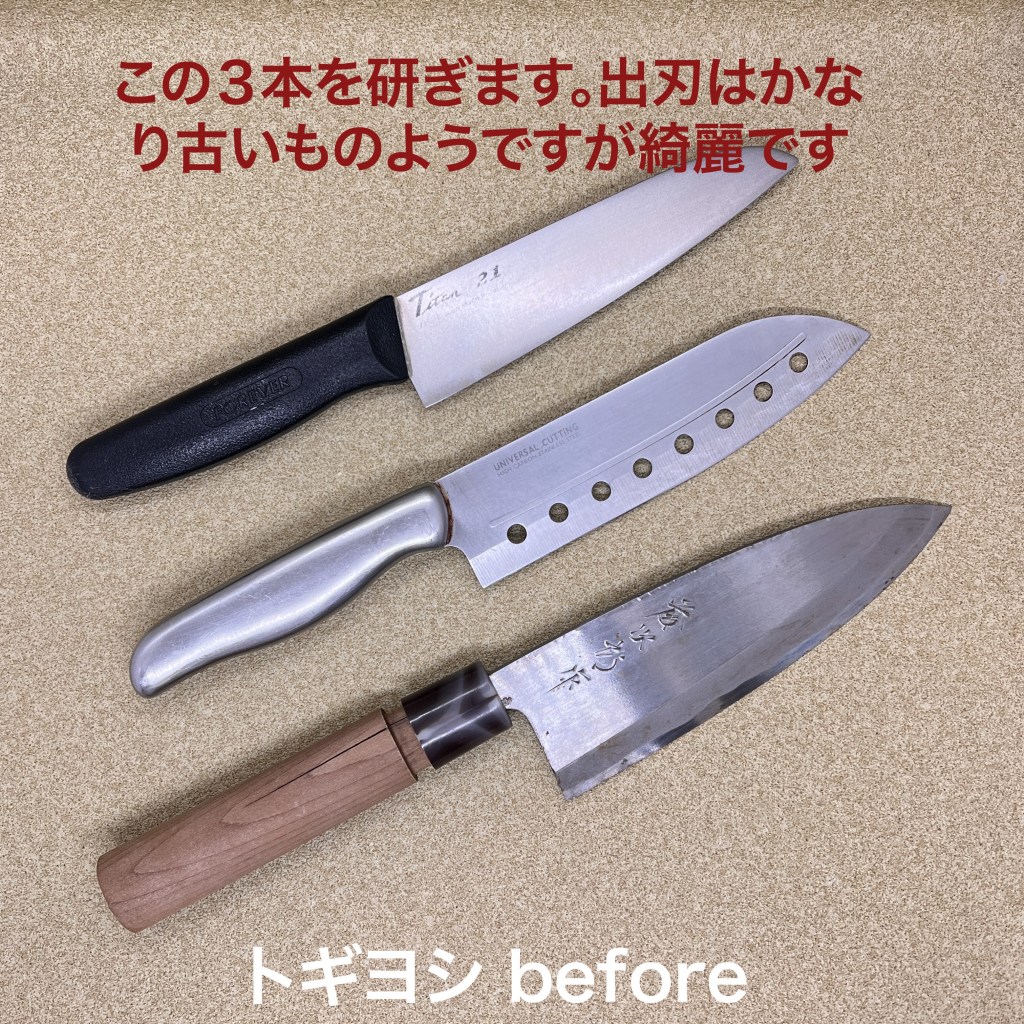 この3本を研ぎ上げました。今日は素材がバラエティ豊か、チタン、ステン、鋼、それぞれの違いを噛み締めながら研ぎました。チタンは非金属の中でもとても強いのですが難切削材としてます有名、また砥石の研粒と反応し研削面が綺麗にならないそうです。出来るだけスムーズに切れるようにはなりました。三徳包丁はステンレスなので特に問題はないかなと思ったものの一度仕上げてから刃先に錆び穴が出て来て一からやり直しました。藤次郎の出刃包丁は刻印からするとかなり前の包丁と思われます。柄も割れているので間違いないでしょう。ですが錆びが全く無く管理がとても素晴らしい包丁です。まあ背は叩いた痕がかなり深くありましたが。あれだけ叩いて刃先はそんなに傷んでいないので、かぼちゃを割るのに使ったのかもしらません。柄を交換して新品同様、いえ新品以上になりました。