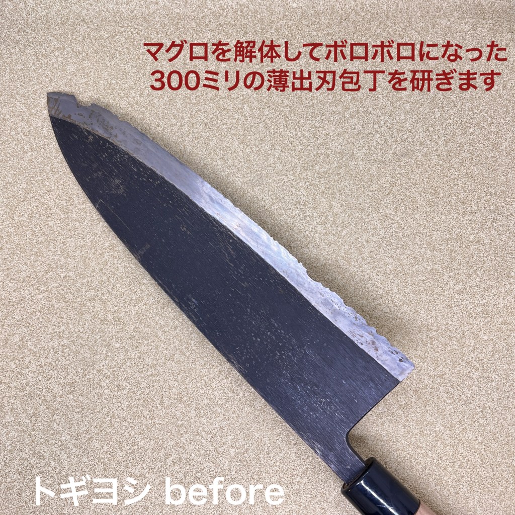 この1本を仕上げました。300ミリの薄い出刃包丁。180ミリの牛刀と並べてみました。この包丁は背の厚さが5ミリくらいしかありません。なので骨を断つのは困難で大きな身を捌く包丁になります。ボロボロに欠けていたのはマグロを捌いて骨を断つ時に欠けたそうです。YouTubeを見ると骨はノコで切っているようです。それだけ硬いという事。その欠けを落とすのに10ミリくらいは削っています。それで厚くなった切り刃を荒砥で落とすのに一苦労。刃先に砥石が到達するまでひたすら研ぎました。今日は中砥からの仕上げ研ぎ。大きい包丁なので重量もあり研ぎ甲斐のある包丁で、無事仕上がりました。