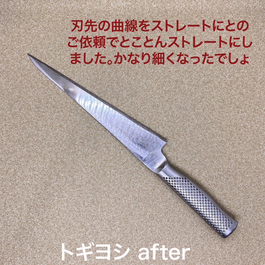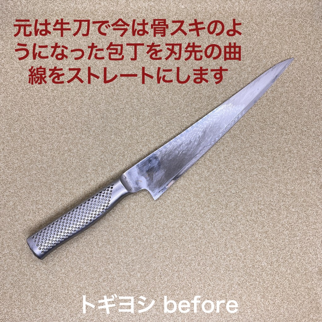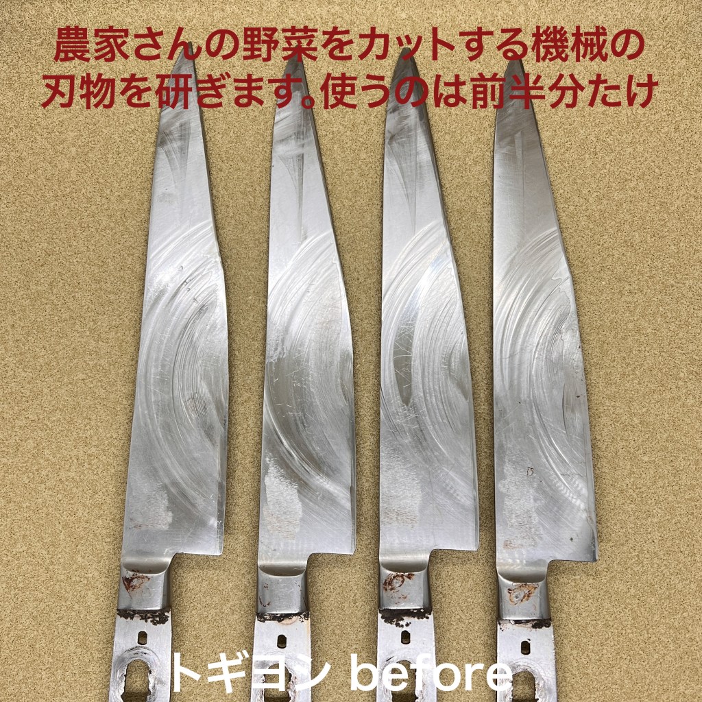 この5本を研ぎ上げました。骨スキのようになった牛刀は刃先の曲線を取ってストレートにして欲しいとのご依頼。荒砥で時間を掛けてガリガリ落としました、そこからの切り刃付けも刃身が厚くなっているのでここからが試練の始まり😅無事切り刃も出来上がり仕上がりました。4本は農家さんの野菜をカットする機械の刃物。afterの撮影を忘れてしまいました。このような機械用刃物も手研ぎ出来るものは研ぎます。今日も気温が高く汗だく💦で研ぎました。