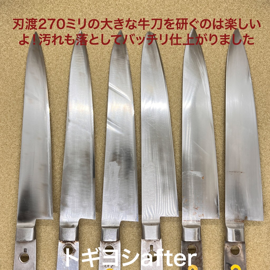この6本を研ぎ上げました。この6も農家さんの野菜をカットする機械の刃物。こちらは全部研ぎとタイプ。牛刀ですから料理する時と同じです。鋭くそして長持ちするように仕上げました。今日も気温が高くしかも海霧で窓も開けられずさらに汗だく💦で研ぎました。痩せたかな?(≧∀≦)