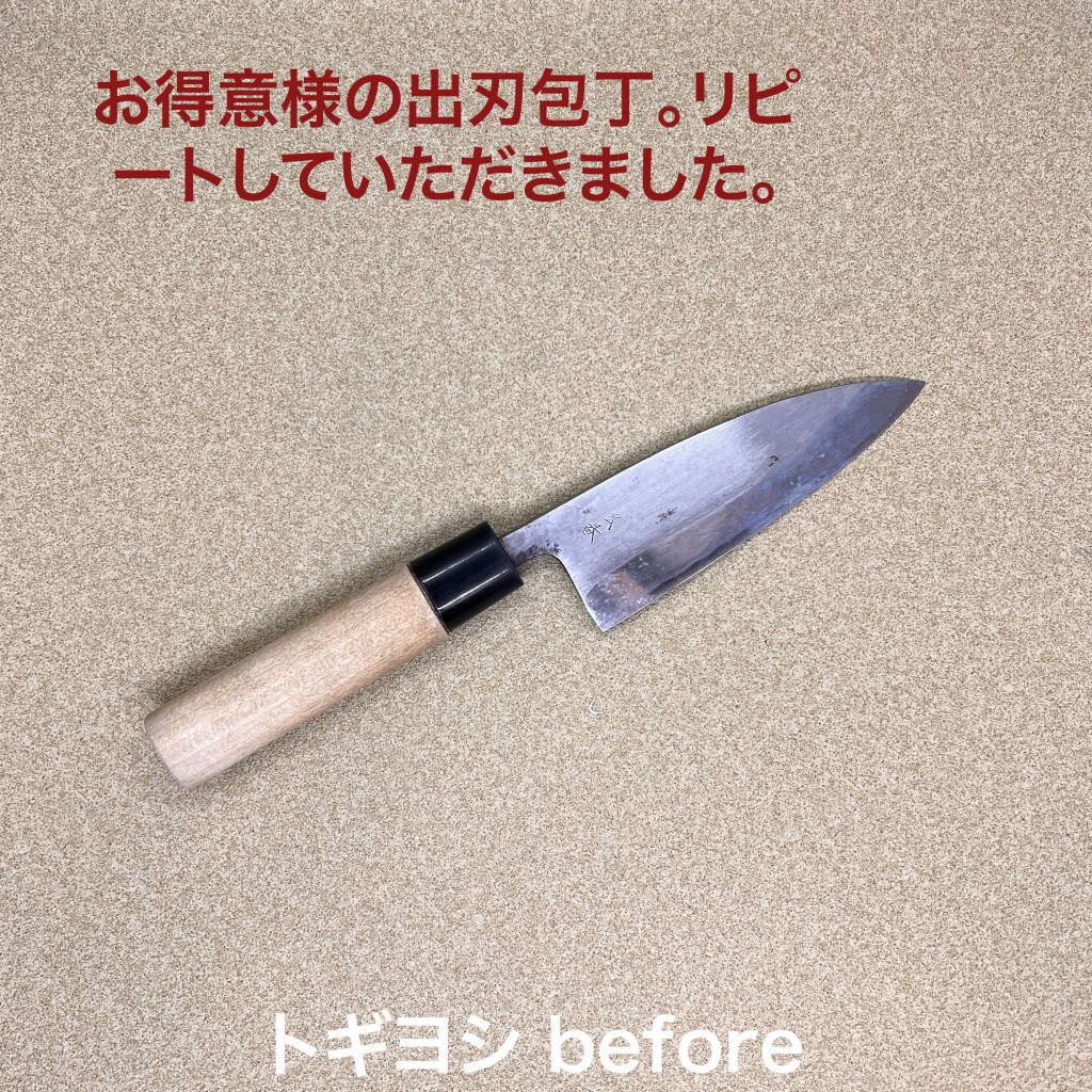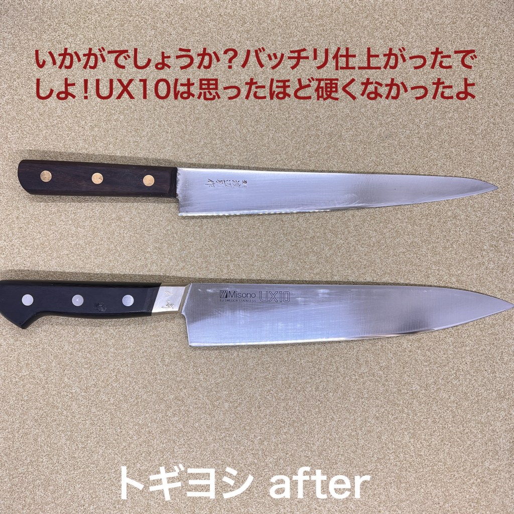 この3本を研ぎ上げました。小さな出刃包丁はお得意様の包丁。リピートしていただきました。軽く刃先が傷んでいる程度でしたので320番で荒砥ぎしてじっくり仕上げました。こらから秋刀魚や秋鮭の季節、出刃包丁のメンテナンスしませんか?前回筋引きを出してくださったお客様、今回は牛刀も依頼されました。筋引きは少し錆びがあったのてゴム砥石で磨いています。切り刃の角度を維持してしっかり仕上げました。ミソノのUX10シリーズはかなり硬い素材。ですが砥石の上を滑る感じではなかったので程よい硬さでした。仕上がりは鋼並に良いですよ!