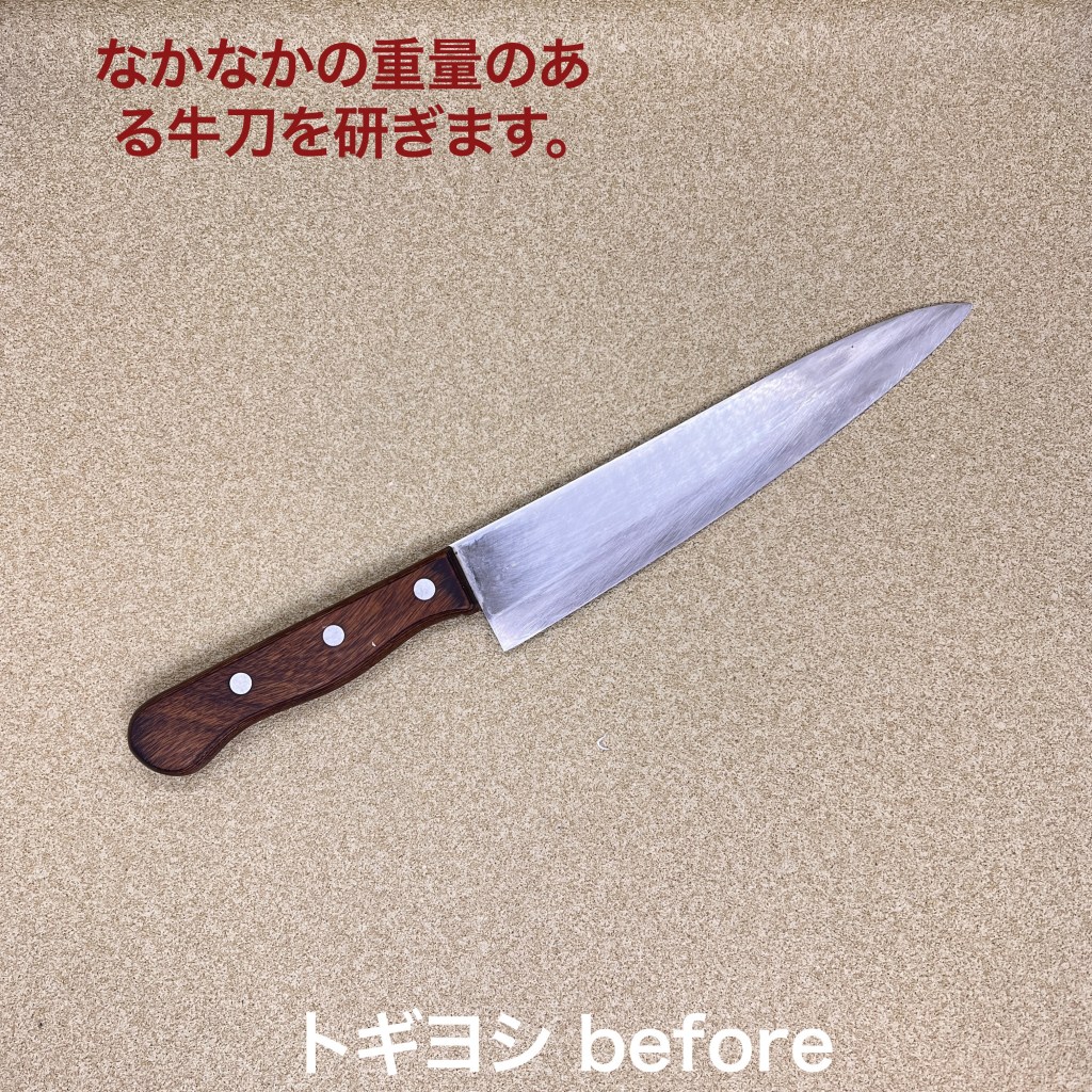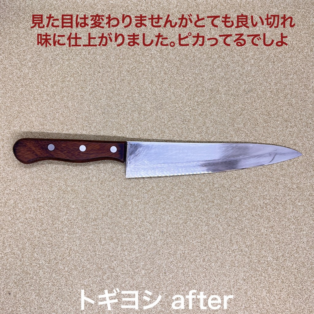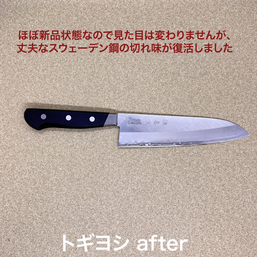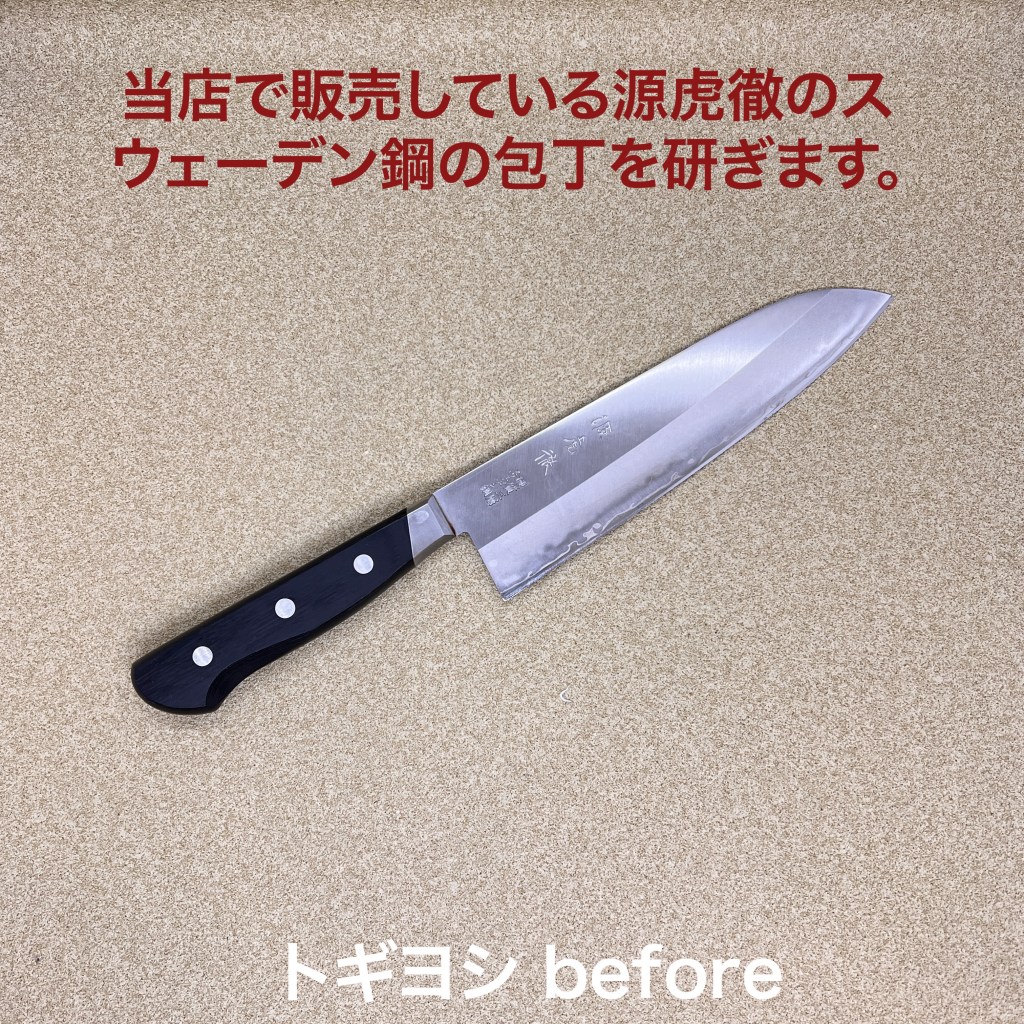 昨日は他にこの2本を研ぎ上げました。先日違う包丁を研いで切れ味が良かったのでリピートしていただいているお客様の牛刀は、背がかなり厚く重量のある包丁。研ぎ方も出刃包丁のように真ん中くらいから切り刃を付けていてまるで両刃の出刃の様です。なので研ぎ方も出刃のように切り刃全面を研ぐ感じで、中砥まで来たら15度に起こして小刃を付けました。皆も虎徹の三徳包丁は芯がスウェーデン鋼、水素の少ない良質の鋼でなので靭性が高く粘り強い特性を持っていてダンプの荷台にも使われています。なので耐久性をお望みでしたらスウェーデン鋼の包丁がおすすめですよ。