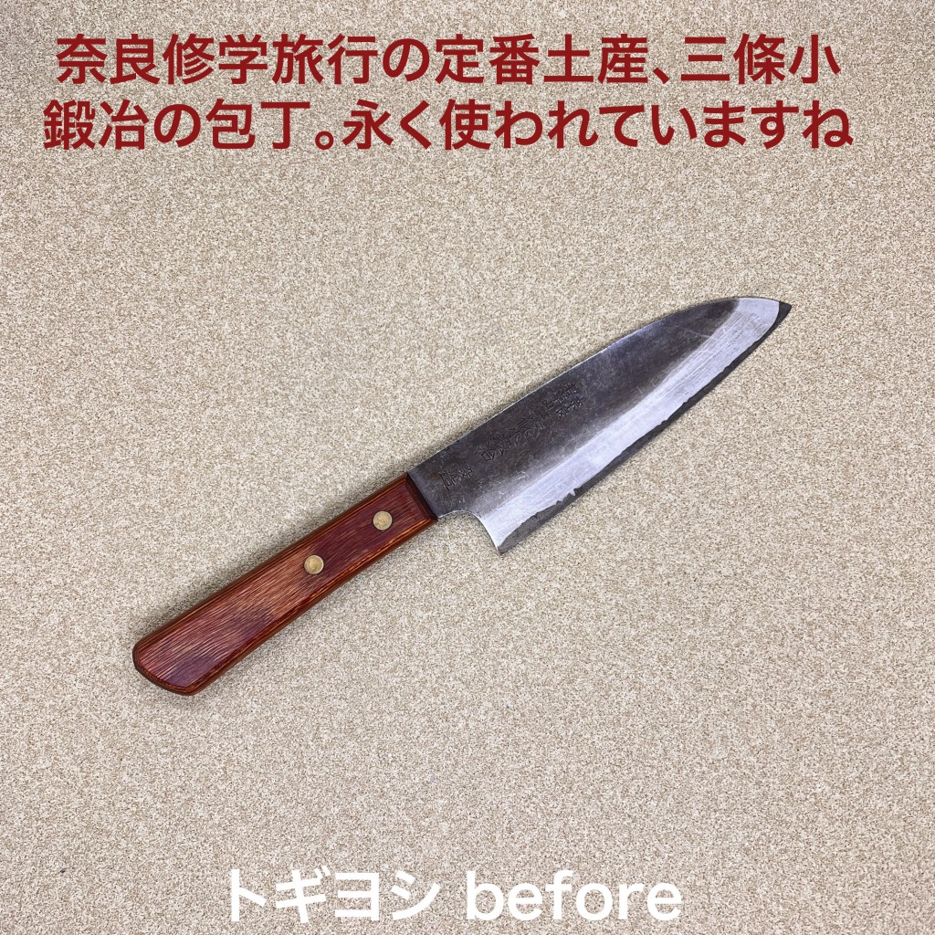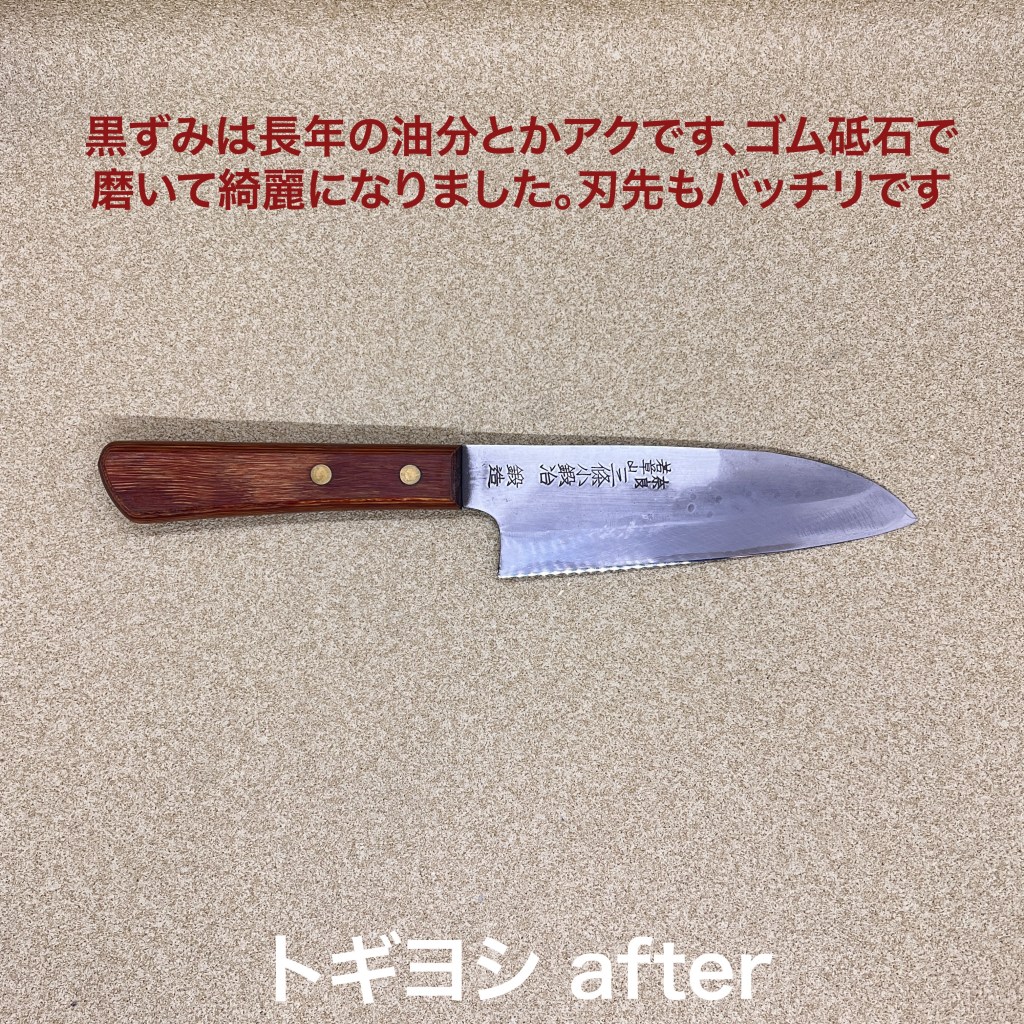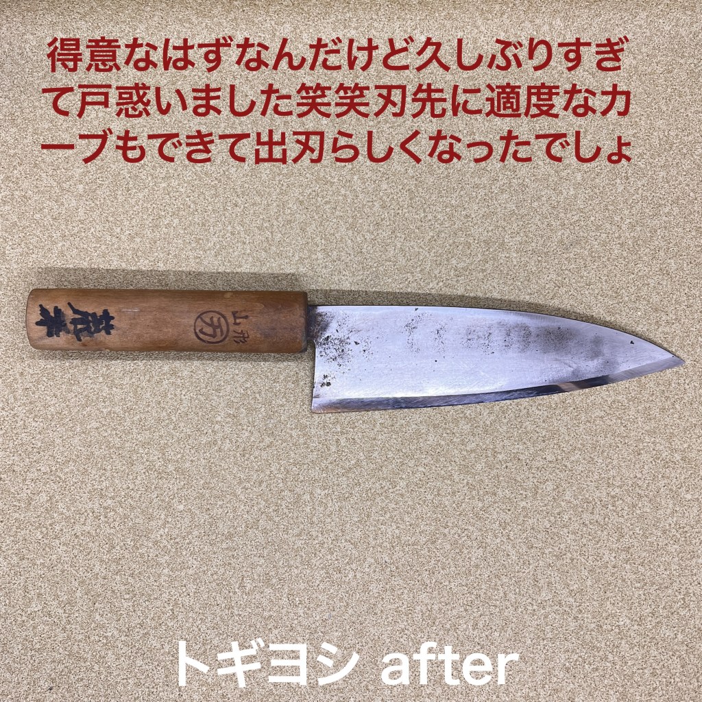 この2本を研ぎ上げました。久しぶりの加工出刃。加工出刃の特性を忘れていて普通に研いだら反って出っ張りの部分が下がっちゃった。思い出して反りに沿った研ぎ方で完成しました。三條小鍛冶に三徳包丁は奈良の修学旅行の定番土産。すぐ分かったのでお話ししたら、どうしても購入したか教えてくださいました。青春の思い出ですね。研ぎの方は、刃先は少し傷んでいましたが大きな影響は無く順調に仕上がりました。加工出刃は新品も販売しています。