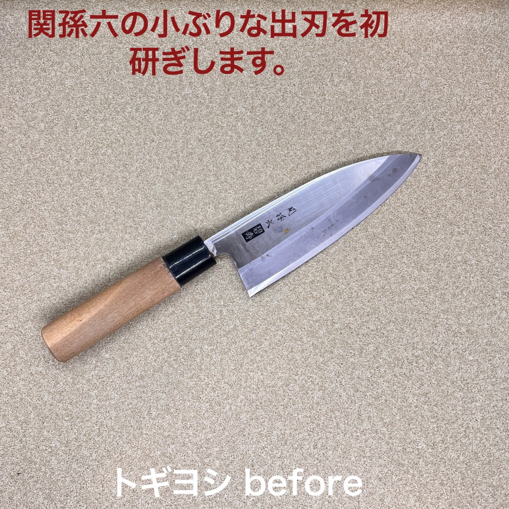 この3本を研ぎ上げました。だいぶ研ぎ進んだ大きな牛刀は刃先1/3が鷲鼻になっており、先端を切り上げるように落として牛刀の形に戻しました。この牛刀も片刃で研がれており両刃に戻さず片刃で研ぎ上げました。柳刃包丁は刃先だけを研いでしまい、二段刃になって切れなくなったという事です持ち込まれました。切り刃を研ぎ直して刃先が出るまでかなり研ぎました。関孫六の小ぶりな出刃包丁は購入されてから初研ぎなるようです。ですが裏に小刃が付けられていて、出刃本来の形ではなかったので刃先を1ミリほど落としてから研ぎ上げました。刃先を落としてしまうと中々刃先が出て来ず研ぎの量はかなり増加します。との包丁もバッチリ仕上がりました。