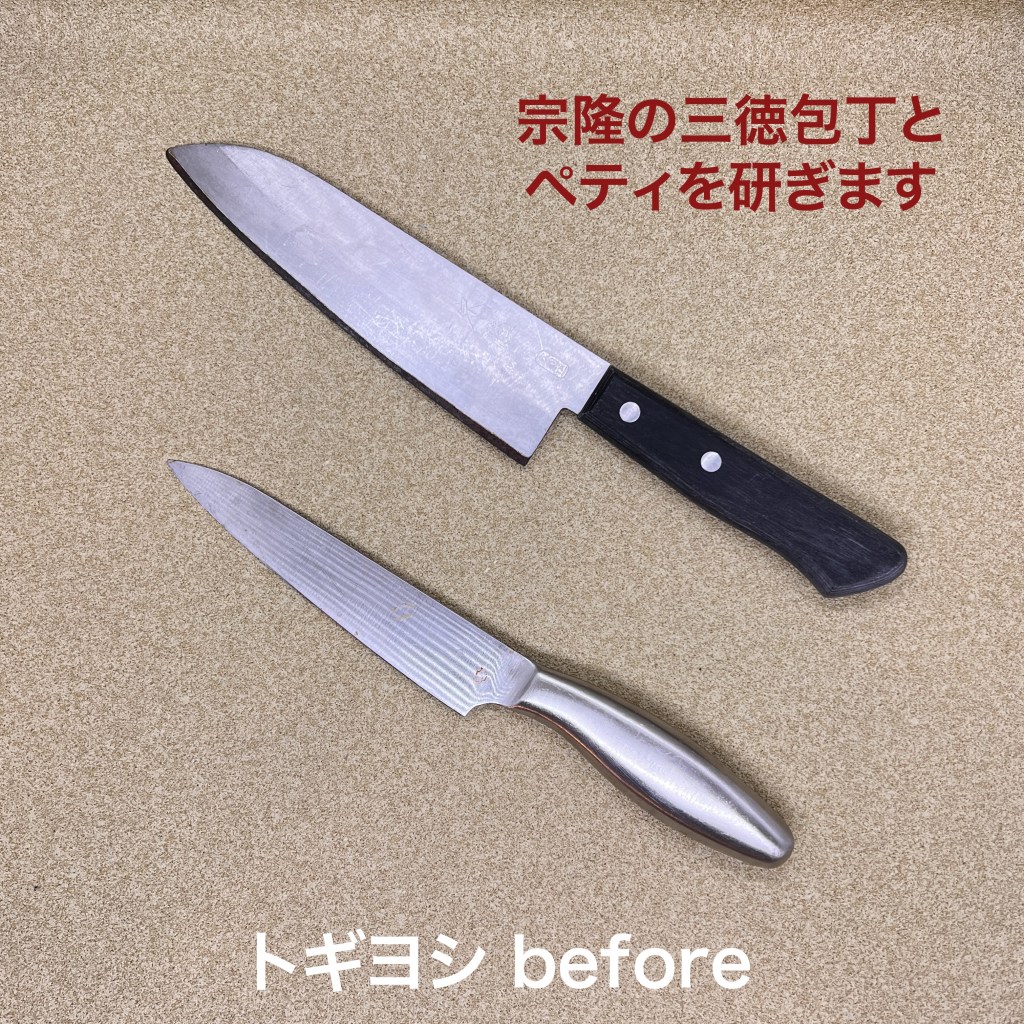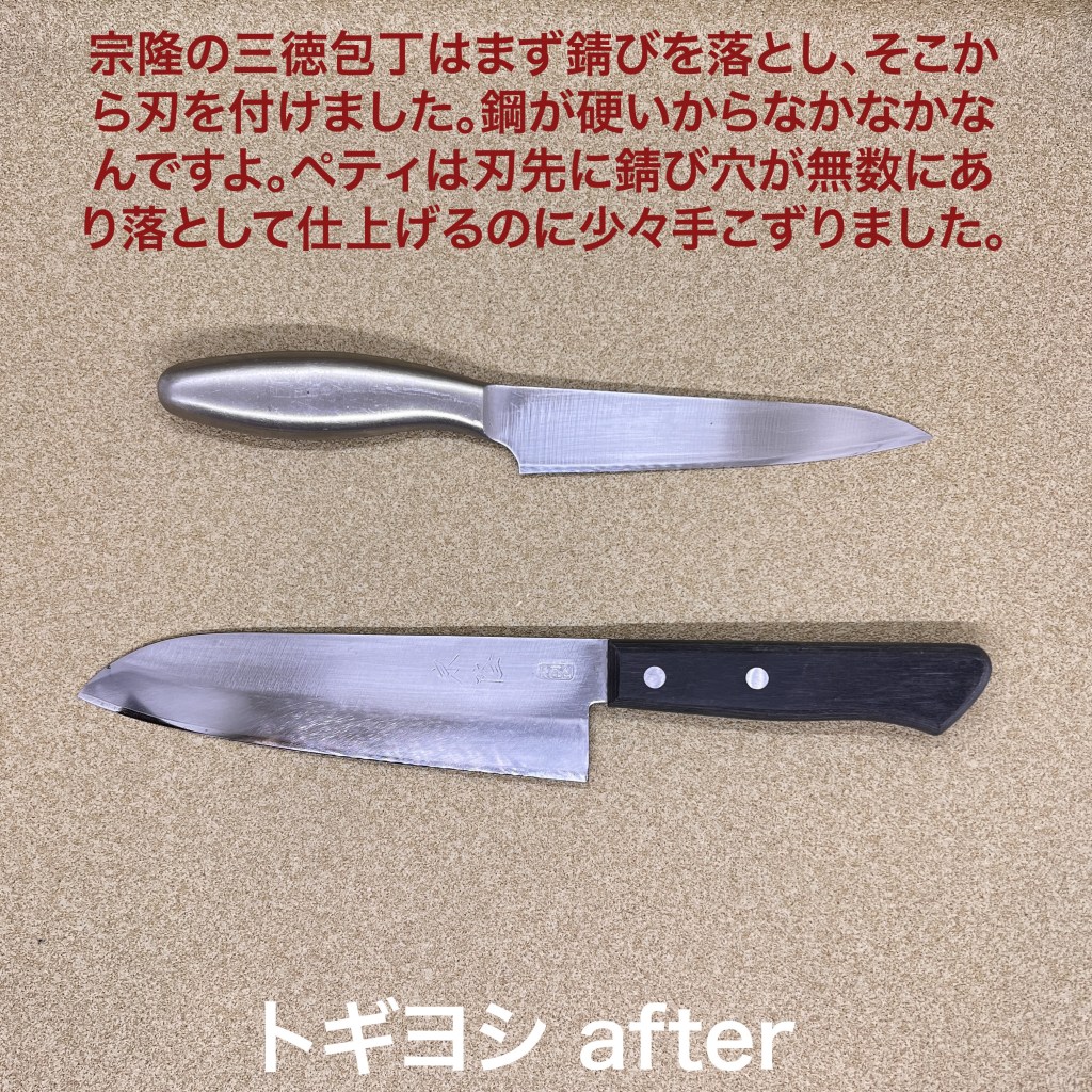 この2本を研ぎ上げました。ペティナイフは刃先に錆穴が無数にあり、強制的に刃先を1ミリほど落としました。そこからの切り刃を付け直し、刃身が厚いでかなり研ぐ量は多くて大汗かきました。良く仕上がりました。宗隆の三徳包丁は修学旅行の定番土産。もう何本研いだことか、もしかしたらひとつのブランドで最多かも?刃先は鋼なので錆びていましたが砥石に当てたらだいぶ消えました。宗隆の鋼は結構硬いので中々刃が付きませんが仕上がるととても良い切れ味になります。