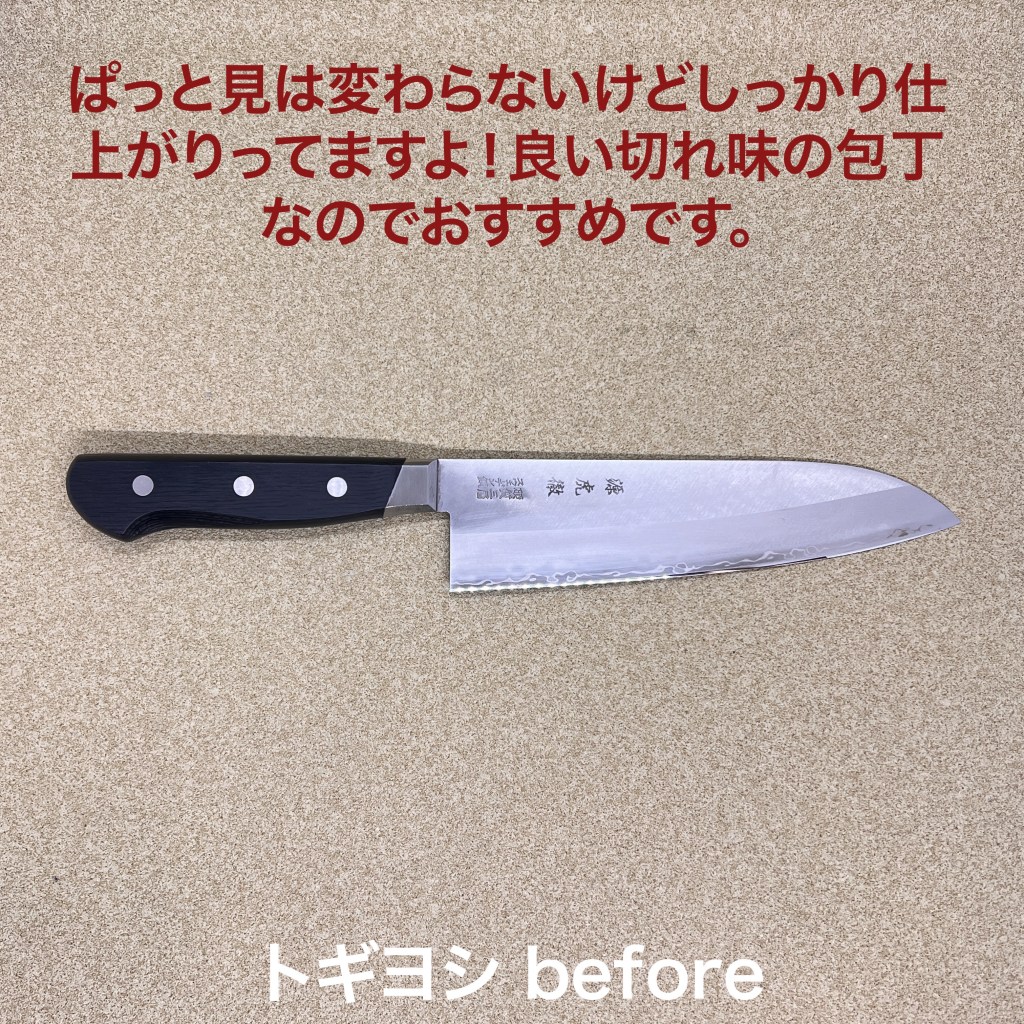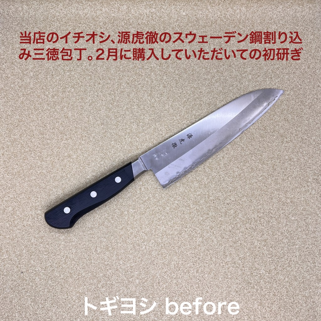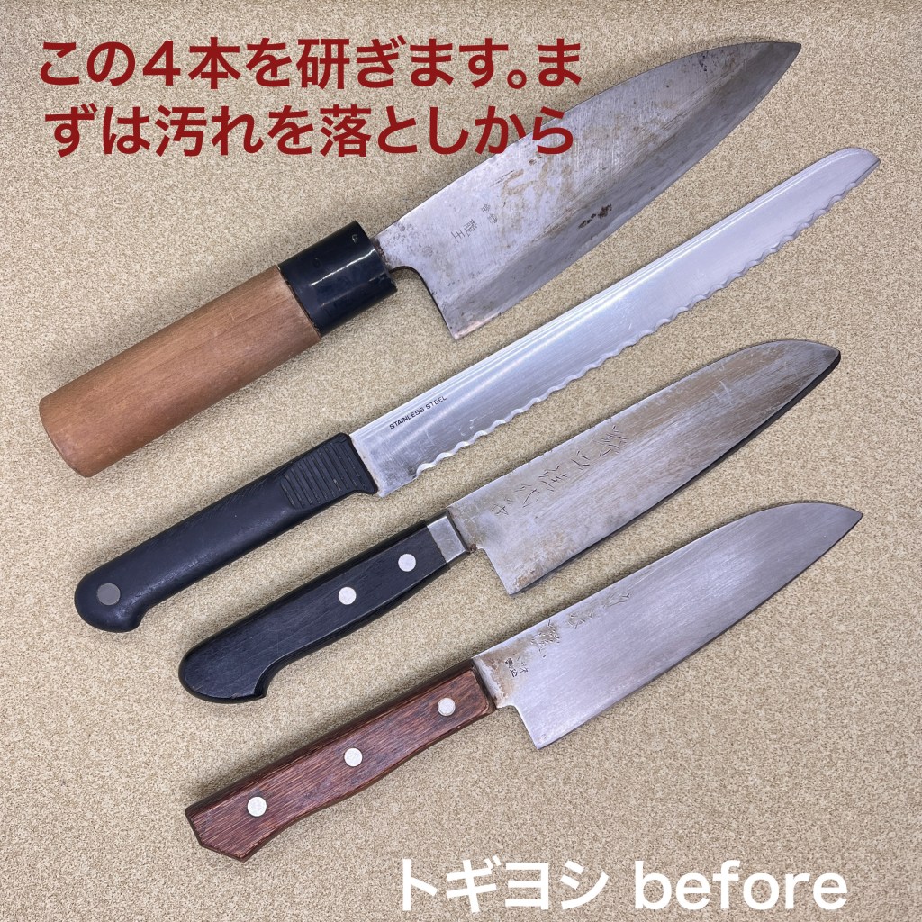 この5本を研ぎ上げました。源虎徹の三徳包丁は当社が販売している包丁。スウェーデン鋼は粘り強く丈夫な鋼なので切れ味も耐久性もとても良いです。新品の販売をしていますので、包丁に迷ったらこれをどうぞ!バラエティ豊かな4本をまとめて研ぎに出していただきました。三徳包丁は油汚れが地積していましたのでアルスの刃物クリーナーを噴霧して10分ほど置くと、簡単に落とせました。出刃は刃先が緩くカーブしていて手前が下がっていたので直して仕上げました。パン切り包丁は刃先がつぶれて反りが多かったので落としただけだもだいぶ回復しますが、丸棒のオイルストーンで谷を研いで反りを取る繰り返しをする事で切れ味は復活しました。