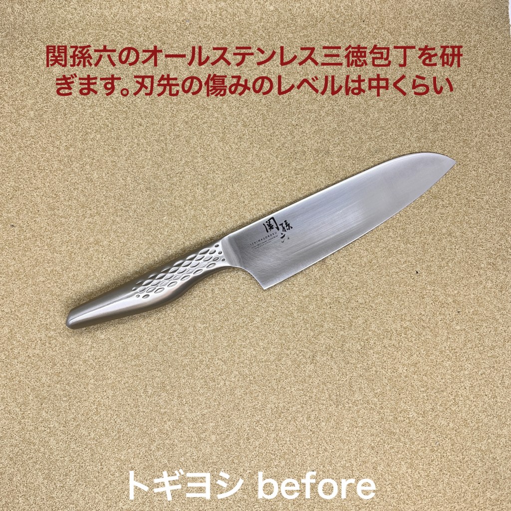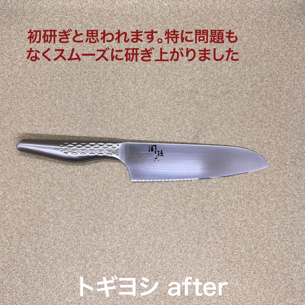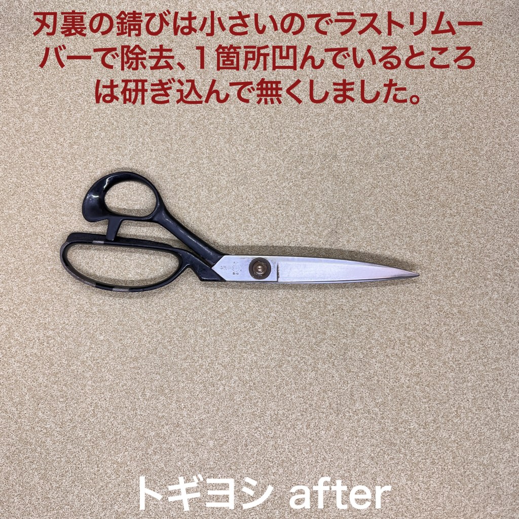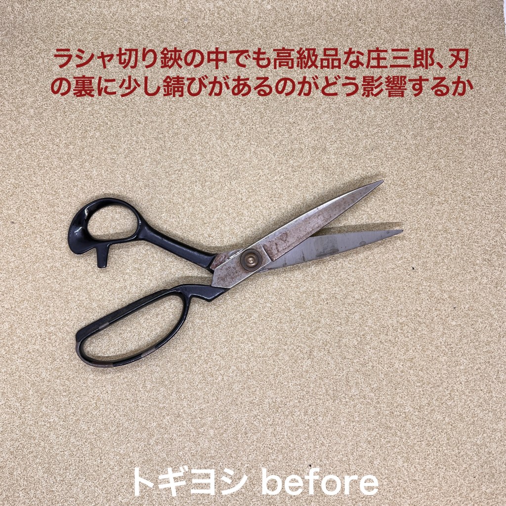 この2本を研ぎ上げました。関孫六のオールステンレスの三徳包丁は傷が全く無いので初研ぎかなと思われます。刃先の傷み具合は中くらい、荒砥でリセットして研ぎ上げました。庄三郎のラシャ切り鋏は派の裏に錆びがあるのと刃先に凹みあるのでどうなるか分かりませんでしたが、錆びはラストリムーバーで落として、その凹みが影響することはありませんでした。それとは別の場所に凹みがあり、研ぎ込んで消しました。ありがとうございます。