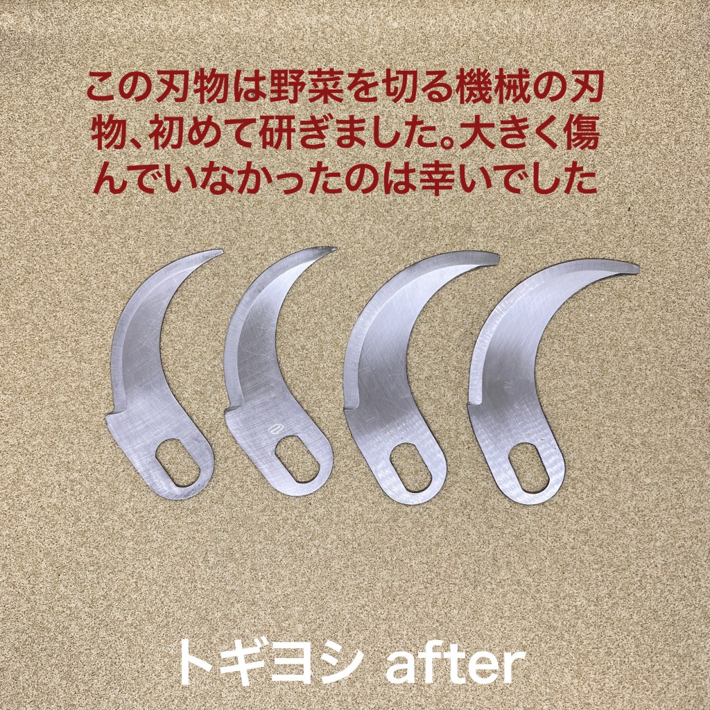 青果商の友人から依頼された野菜をカットする刃物。初めて研ぎますが基本は包丁と同じ。刃の状態は刃先も切り刃もそんなに傷んでいなかったので小刃を中心に研ぎ上げました。荒砥は使わず中砥で調整して#8000で仕上げました。研ぎ方は包丁とは全く違うので保持するのになかなか大変でしたよ。