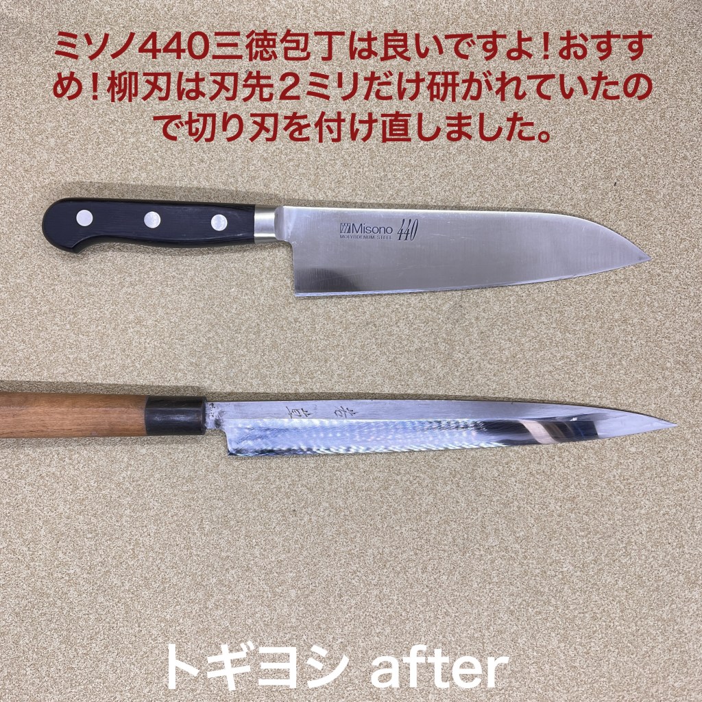 ミソノの440三徳包丁はステンレスの中でも高級鋼になり、お値段もそこそこしますが切れ味は一段と高いのでおすすめです。刃先を見たら傷んてキラキラ輝いていましたが、一点の光のない状態に仕上がりました。柳刃包丁は刃先2ミリだけ研がれていて、柳刃本来の切れ味を失っていました。更に手前3センチくらいの所が下がっていて、刃先が一直線ではありませんでした。まず刃先平にしてから切り刃を研ぎ出して前の研ぎの癖を無くし仕上げました。