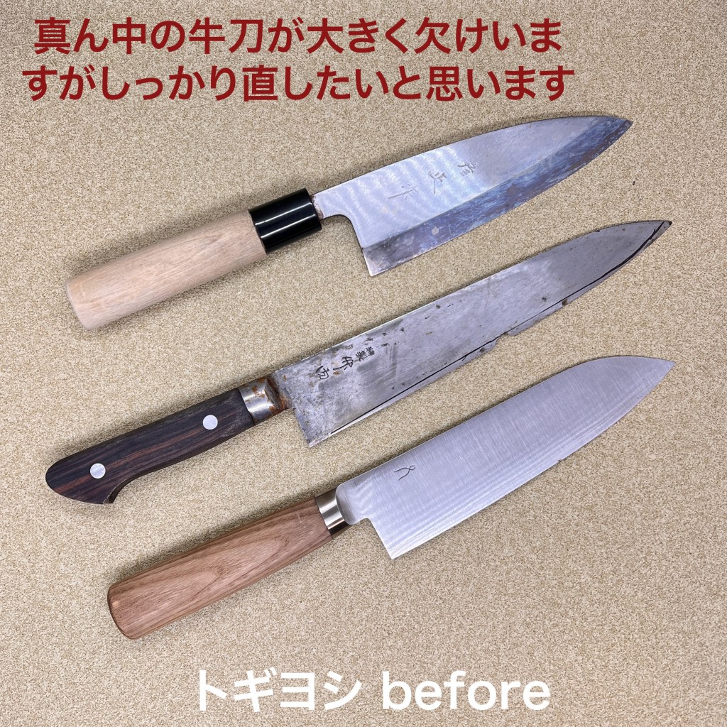 出刃包丁は以前に研いだ包丁。今年も研ぎに出してくださいました。刃先の傷みは少なくスムーズに仕上がりました。大きく欠けた牛刀は手前の高さは残して先に向かって落して欠けを無くしました。鋼なので結構硬かった。三徳包丁は刃先に小さな錆びを気にされていましたが荒砥で簡単に消えました。どっちかいうと柔らかめの材質ですぐに落ちてあっという間に仕上がりました。大きな牛刀3本は精肉を切る包丁🔪毎日ハードに使う包丁切れ味と耐久性の向上目指して仕上げました。