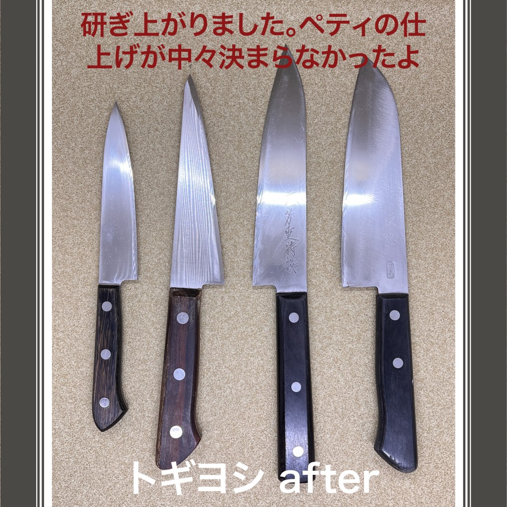 宗隆の三徳包丁は鋼部分が錆びていましたが深くなくサッと研いで綺麗になり仕上がりも上々。芳重の牛刀は癖のある研ぎ方になっていて最低限の修正に留めて仕上げました。藤次郎の骨スキは柄に魚の脂が蓄積していたので出刃庖丁代わりに使っていた模様、インパクトクリーナーとスクレッパで落としてスッキリしました。刃の方は15度できっちり仕上げましたよ。ゾーリンゲンのペティは中々最終日仕上げか決まらず少し時間がかかりました。あと出刃を2本預かりましたが錆びで真っ赤っかなのでサビハイダーでゆっくり錆びを落とします。