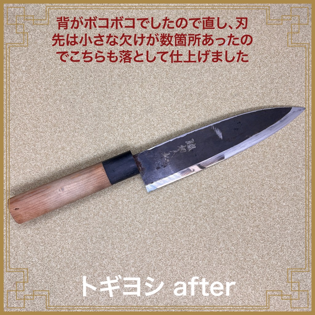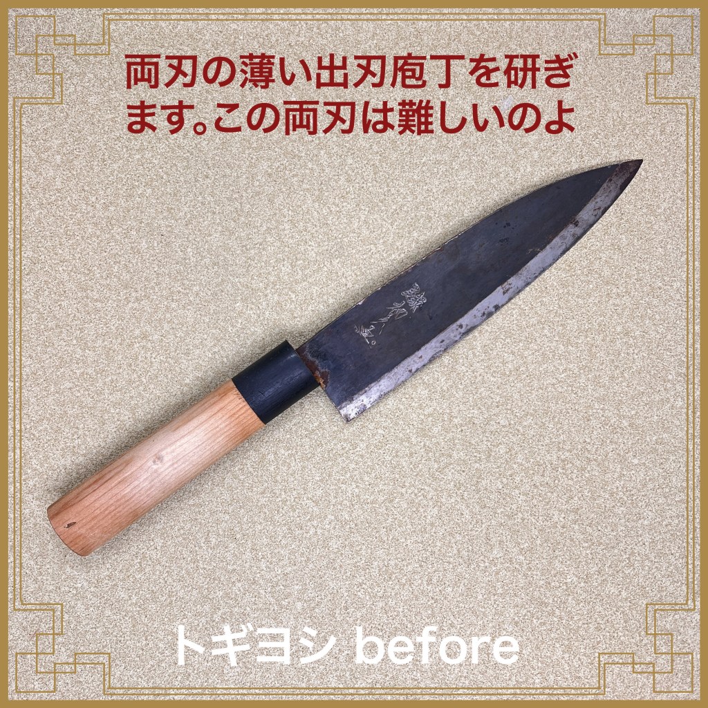両刃の薄い出刃庖丁、相出刃とも言うのかな?自分の知識では判っていません。状態は背が大きく変形している事、仕方がないのでディスクグラインダーで削りました。刃先は少し欠けている箇所があったので落とし仕上げました。