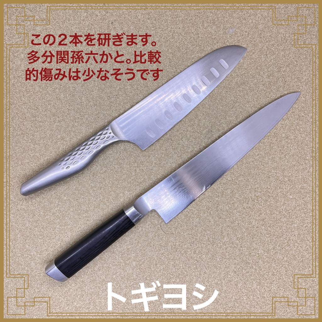 ラベルが消えていますがうっすら関の文字が見えたので関孫六かと思います。三角柄の牛刀はとても持ち易いと思います。研ぐときとても安定しています。三徳包丁は刃先に少し傷みがあるくらいでスムーズに研ぎ上がりました。牛刀の方は研ぐ前に気付かなかったのですが先端近くの刃先に錆穴が数個あることが判り包丁を立てて刃先を落としてから研ぎ上げました。本来の切れ味を楽しんで下さい♪