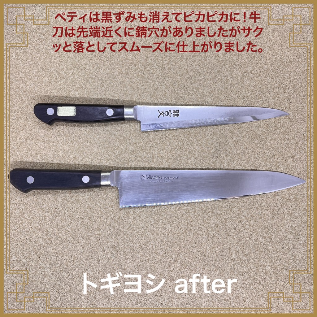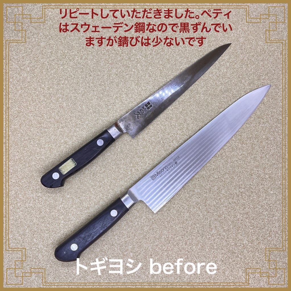 お得意様の包丁。ありがとうございます。宮文のペティは少し長めの170mmはスウェーデン鋼なのでどうしても黒ずみます。耐水ペーパーやゴム砥石で磨くと良いのですが、ちょっと怖いですよね。シンクの平なところに刃をおいて擦れば大丈夫ですよ。以前に刃身を落としていますので、今回は大きな修正はありませんのでスムーズに仕上がりました。ミソノの牛刀は先端の方にサビ穴を発見、重症ではなかったのでサッと削って順調に仕上がりました。