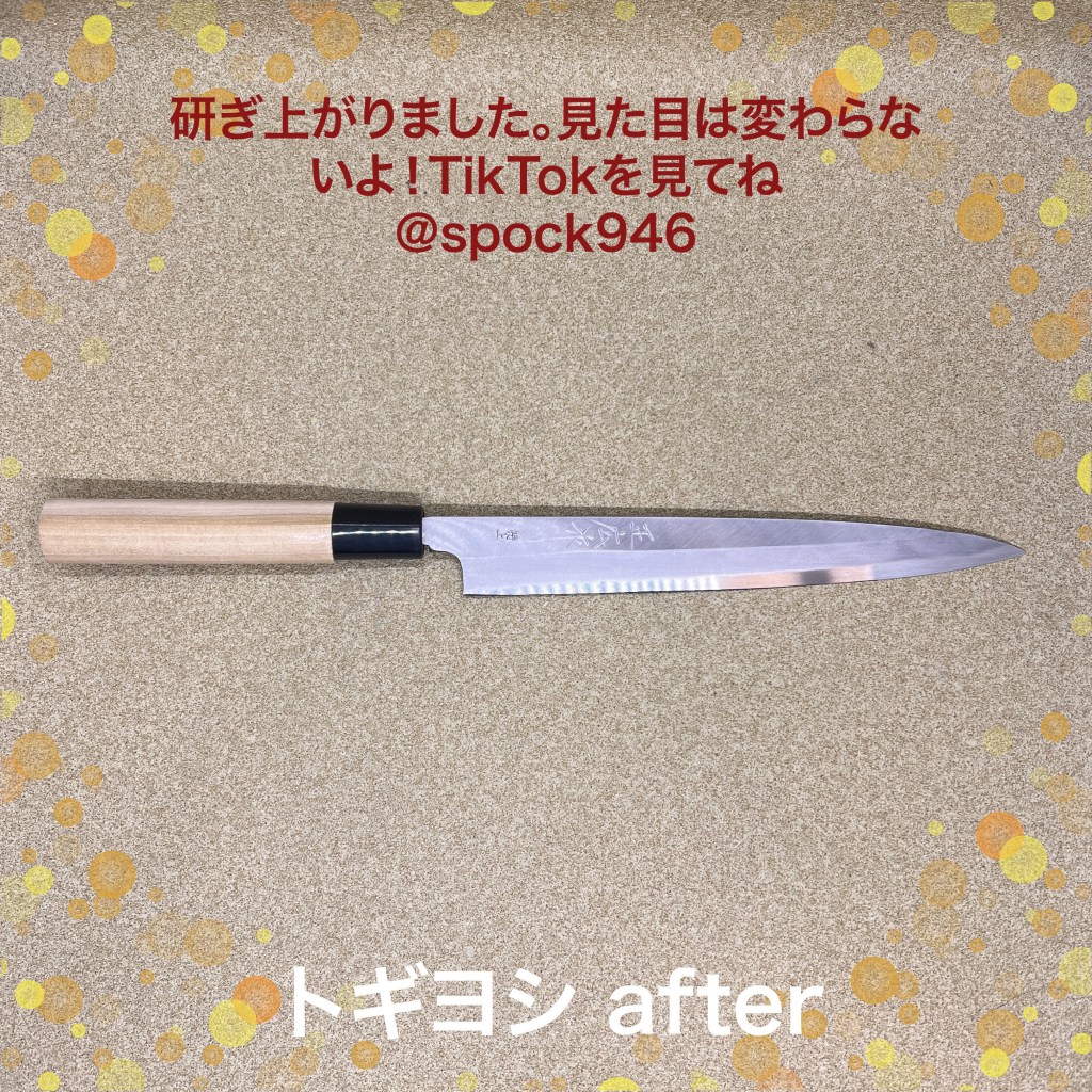 新品の柳刃包丁は仕上げ研ぎをしました。新品だからといって切れるとは限りません。今の所和包丁は本刃付けになっていないことが多いのと、価格の安い包丁も同様です。仕上げ後は圧倒的に軽く切れるようになりました。紙を切ったのでもう一度軽く仕上げ直しています。大きめの出刃は中々の強者でした。切刃の半分から刃先に向かって多分45度位で研がれていてまるでナタのようになっていたうえに裏も角度を付けて研がれていたので数日掛けて出刃本来の形に戻しました。TikTokに動画をアップしましたのでよかったら見てください。@spock946