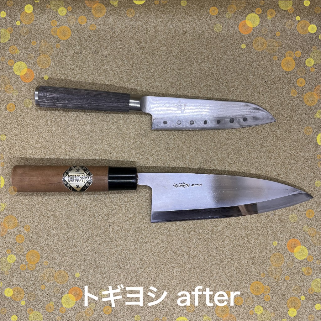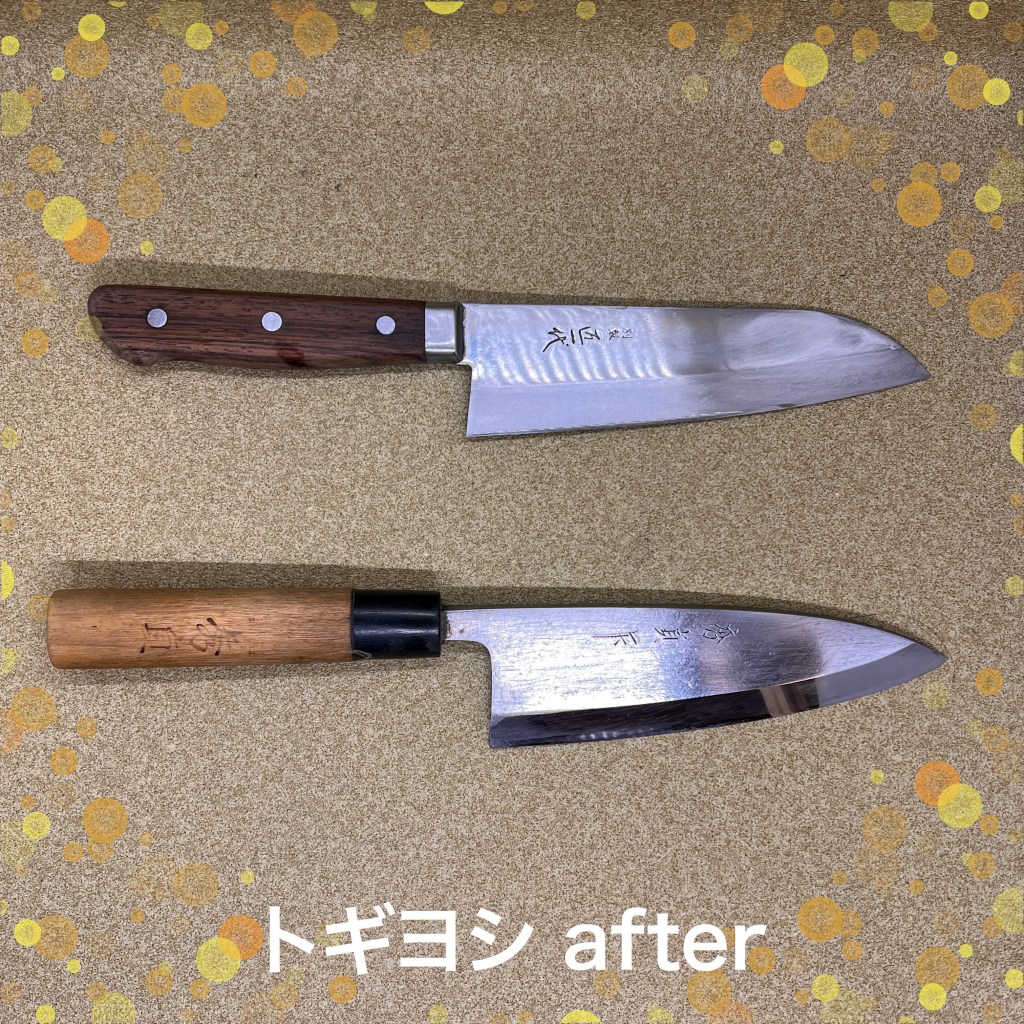 匠一代の三徳包丁の刃先は手前が凹む鷲鼻になっていましたのでフラットからすこーしカーブを持たせて新品の様な形に戻し、腹が傷だらけだったので傷消しも行いましたが、切刃の部分は製造時の砥石の曲率の関係ですこーし凹んでいましたので50%くらい落としで終えています。秀貞の出刃庖丁は切刃の角度がまちまちでしたので20度で一定になる様に形を作って仕上げました。小ぶりな三徳包丁は大のお得意様の包丁、いつもありがとうございます。今回もバッチリ仕上げました。くしろ大津屋の出刃包丁は見た感じ綺麗なのですが、仕上げに入ると刃先がポロポロと欠けるのです、2、3度中砥に戻ってを繰り返しようやく仕上がりました。