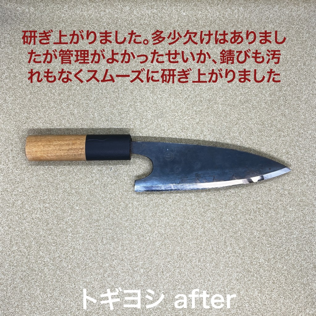 丸重印の加工出刃!今までにも研いだ事あると思うのですが、人差し指がかかる場所が包丁の腹の方まで入るようにエグれているの初めてのような気がします。包丁の状態は2、3箇所の欠けはありますが管理が良く、錆びも汚れも無いためとてもスムーズに仕上がりました。やっぱり包丁は綺麗にしておくのが大切です♪