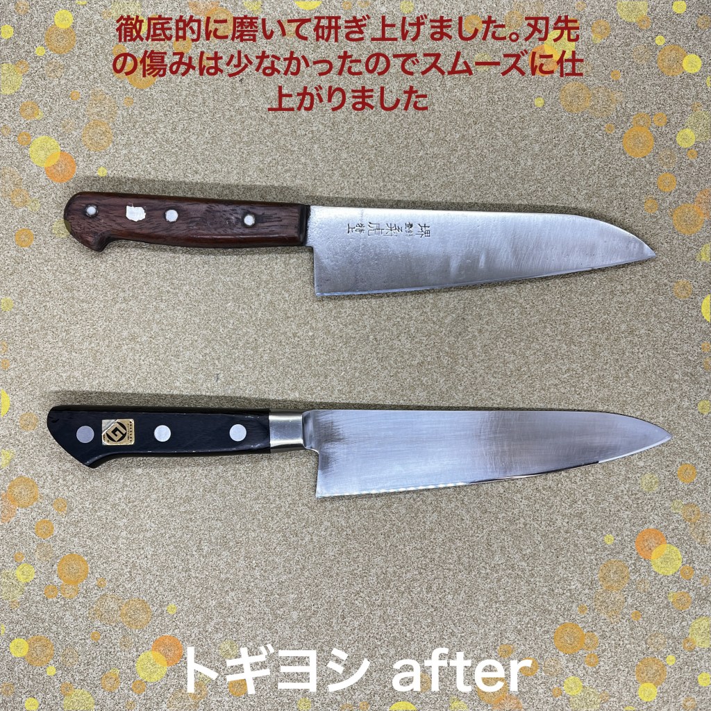 菊虎の牛刀は黒んずでしまっていますが赤錆は見当たりませんでした。黒ずみを落としたら錆穴が無数にあり、軽く削ってみましたが錆穴を落とすにはかなり削る必要があるので今回はパス。刃先の方はまあまあ傷んでおり荒砥で落とし普段通りに研いでスムーズに仕上がりました。藤次郎の牛刀は傷だらけなのが気になったので傷を消してから刃先を研ぎます。刃先はそんなに傷んでいなかったのでこちらもスムーズに仕上がりました。