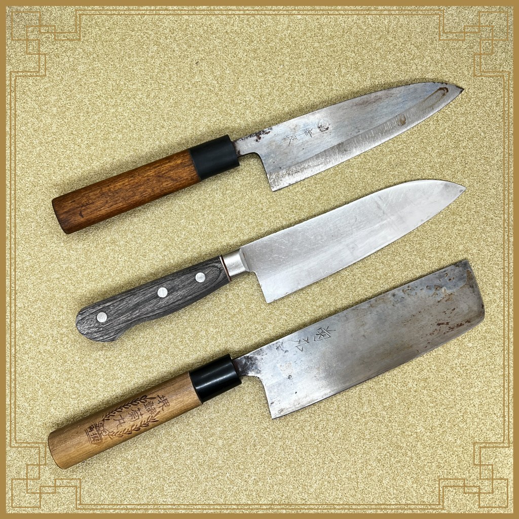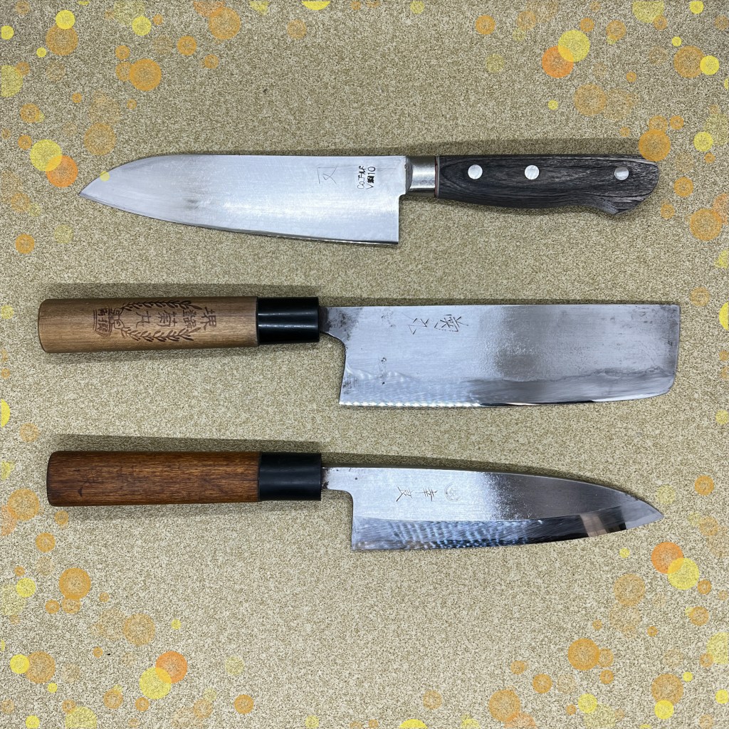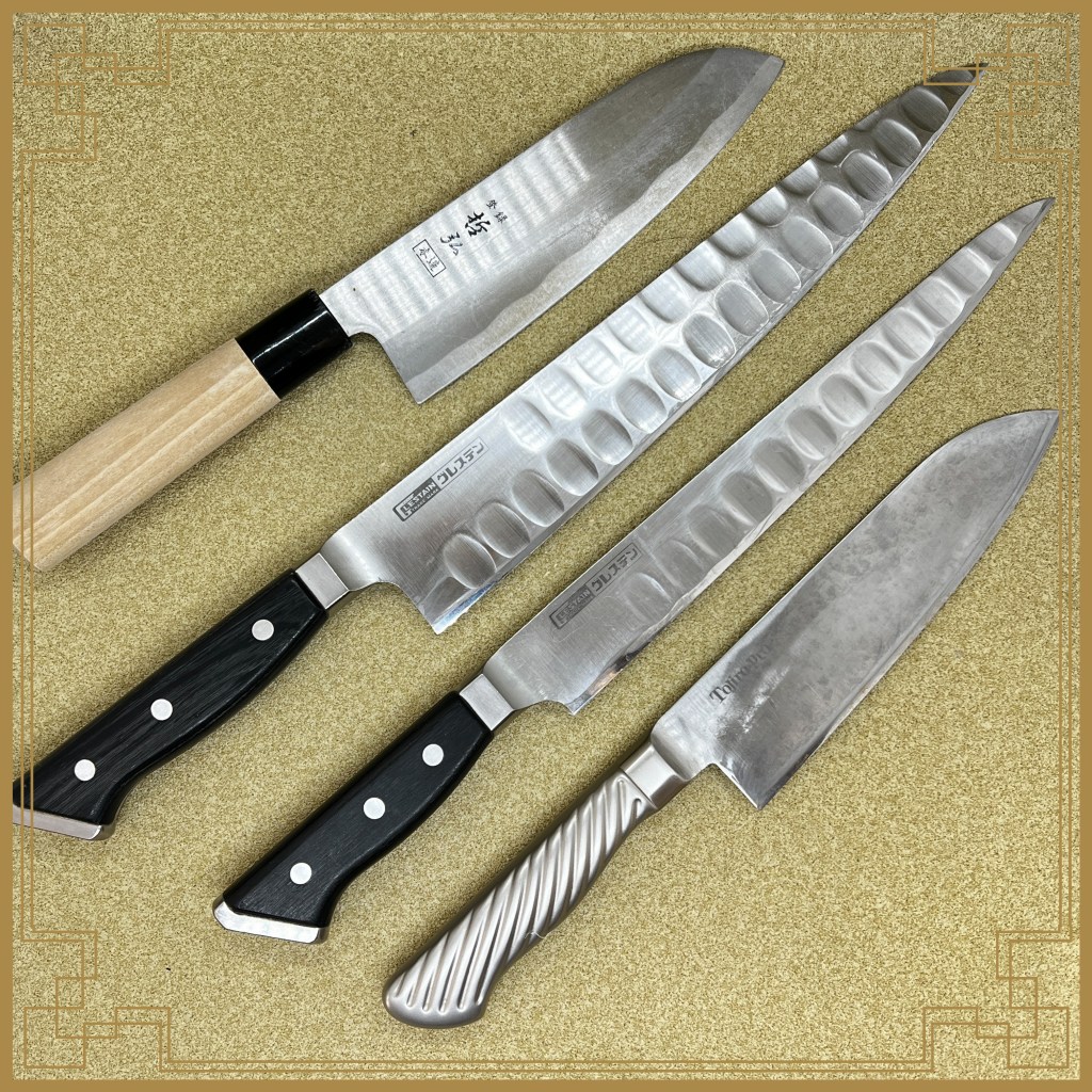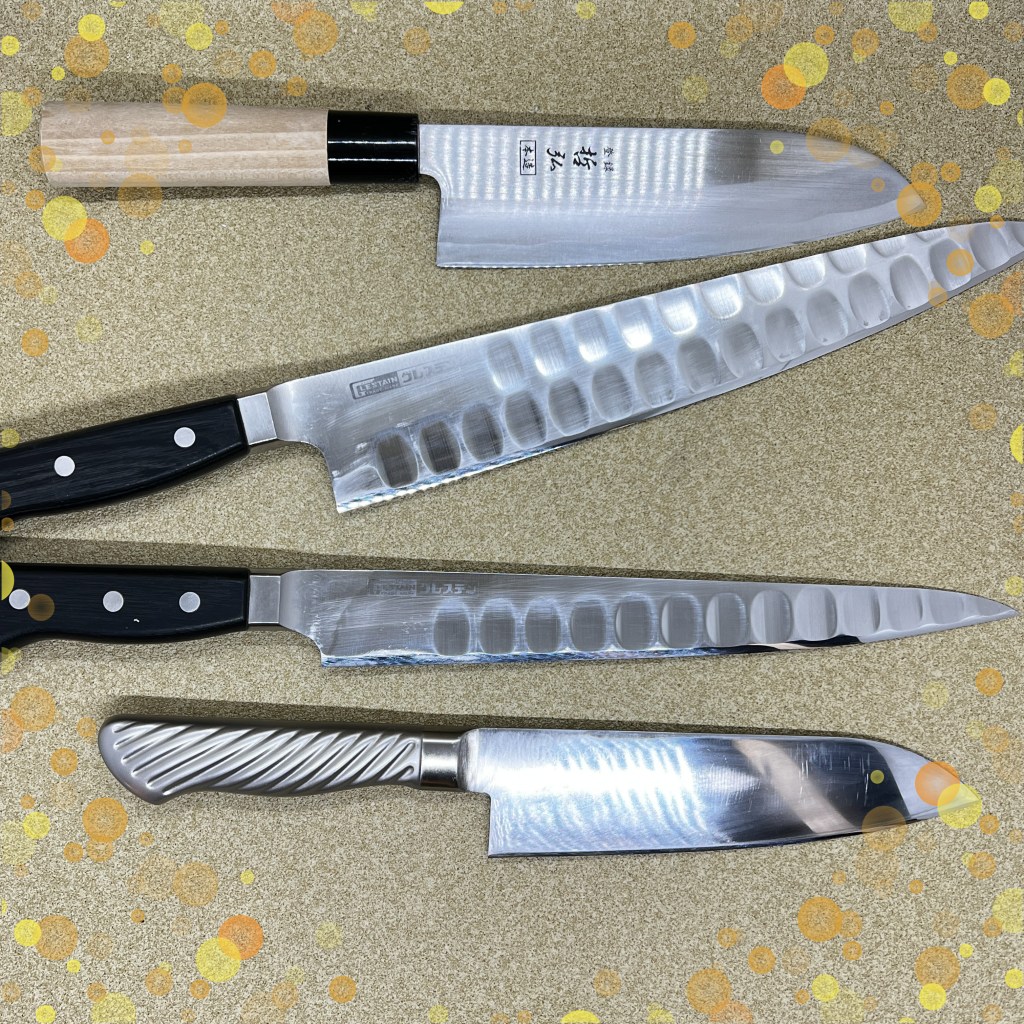 幸良の出刃包丁はベルトサンダのかなり荒目で削ったようで深い研磨痕になっており、形状もはまぐり刃になっていましたので荒砥で一旦20度にしたら刃先しか砥石が当たらなかったので少しづつ立てて結局15度で全て落とし仕上げました。菊丸の菜切包丁は刃の肌が凸凹していましたので、切り刃の部分だけ磨き上げて刃をつけています。かなり硬い材質でなかなか研ぎ上がりませんでした。角又の三徳包丁はCoゴールドV鋼と刻印がありますので芯鋼がコバルトモリブデン鋼なのかな?こちらもかなり硬かったですよ。腹の部分は傷みは少ないのでゴム砥石で磨いて綺麗にしました。長い包丁他4本は麺屋武双さんの包丁達、定期的に研ぎに出してくださりまして誠にありがとうございます。藤次郎の三徳包丁は刃先に深めのサビ穴がいくつかあったので、1ミリほど刃先全体を落としてかた研ぎ上げました。ステンレスも錆びますので良く乾かしてから仕舞ってくださいね。グレスデンの牛刀、筋引きはもう何度も研いだ包丁。今回刃先の痛みは少なかったので順調に仕上がりました。哲弘の和柄三徳包丁は初研ぎでしたのでいつも通りの研いだのですが、仕上げに少し手こずりましたがバッチリ仕上がっていますよ。
