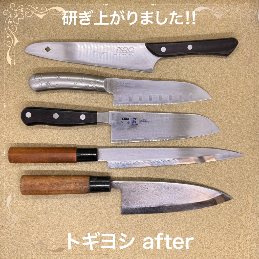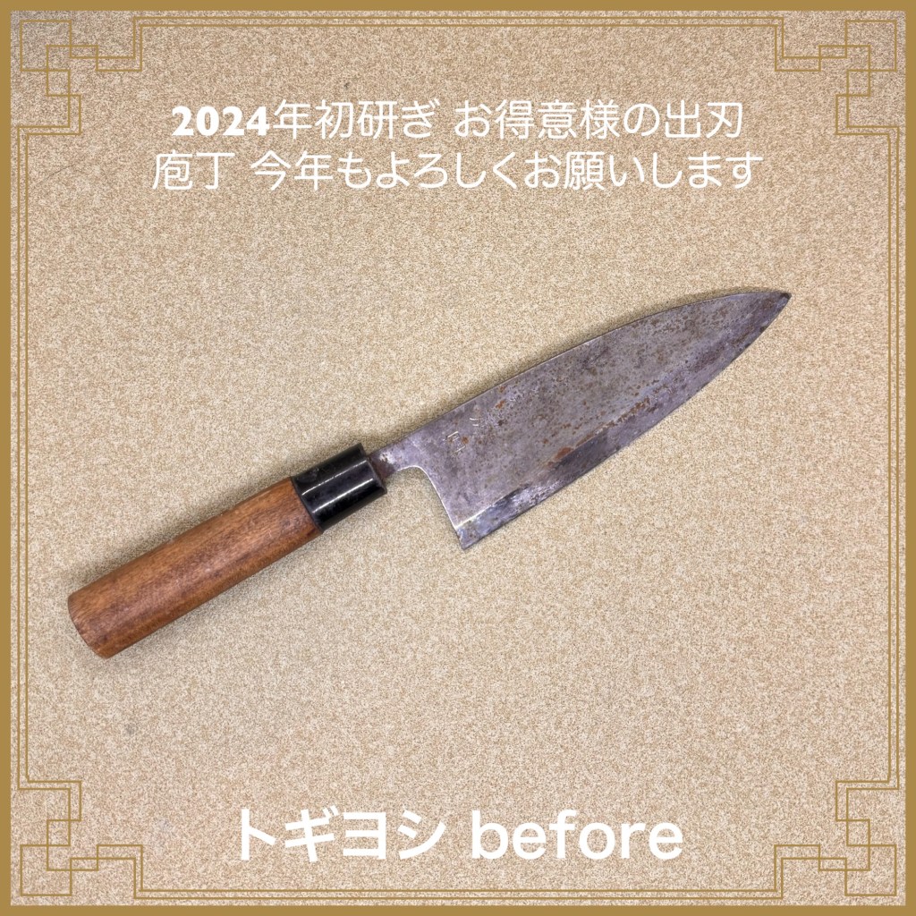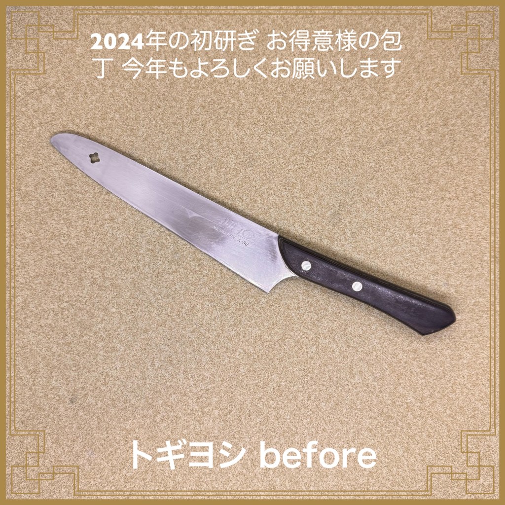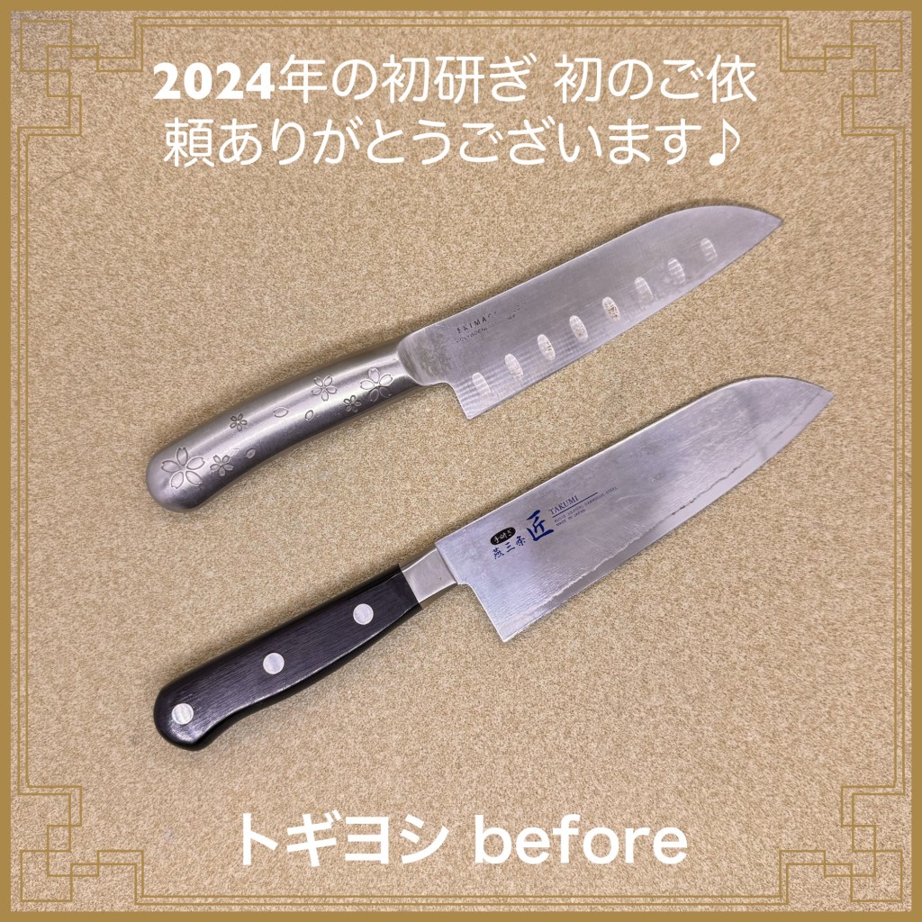 この5本を研ぎ上げました。2024年もトギヨシをよろしくお願い申し上げます。菊虎の出刃庖丁はお得意様の包丁。軽く錆が浮いていましたが問題はありません、刃先は少し欠けていましたのでリセットして研ぎあげました。兼房の柳刃包丁はかなり年季の入ったモノ、切刃がだいぶクセの強い研ぎ方でしたが一定の角度に研ぎ直しました。MACの牛刀はお得意様にの包丁、いつもありがとうございます。少し刃身が厚かったので落として仕上げました。2本の三徳包丁初めてのご依頼ありがとうございます。オールステンレスの方はスムーズに研ぎ上がりました。燕三条 匠ブランドの包丁の芯鋼がかなり硬く少し時間がかかりました。
