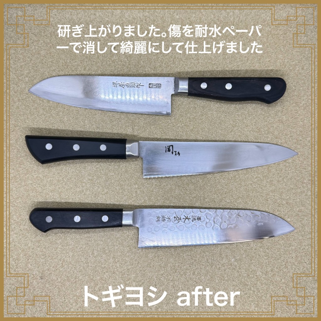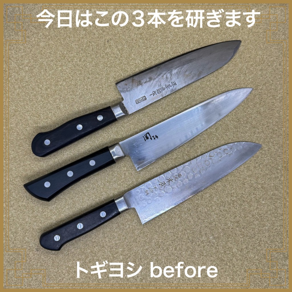 この3本を研ぎ上げました。いつもありがとうございます。堺屋直助の三徳包丁は初めて研ぎ、前に研がれた状況はあまり良い状態ではありませんでした。刃面を耐水ペーパーで磨いて傷を消し、刃先は小さい欠けもあり荒砥でリセットして仕上げました。関孫六の牛刀はお得意様の包丁、一度研いでいますのでスムーズに研ぎ上がりました。木屋の三徳包丁は不銹鋼=ステンレスなんです。研いでみたら結構硬い感じでした。雑感ですが、荒砥にシャプトンのロックスター#320を使い始めたのですが、ステンレス包丁では良い感じなのですが、鋼の包丁では滑る感じがします、刃の黒幕の#320の方が柔らかくて研ぎ易い気がします。減りは早いけど。