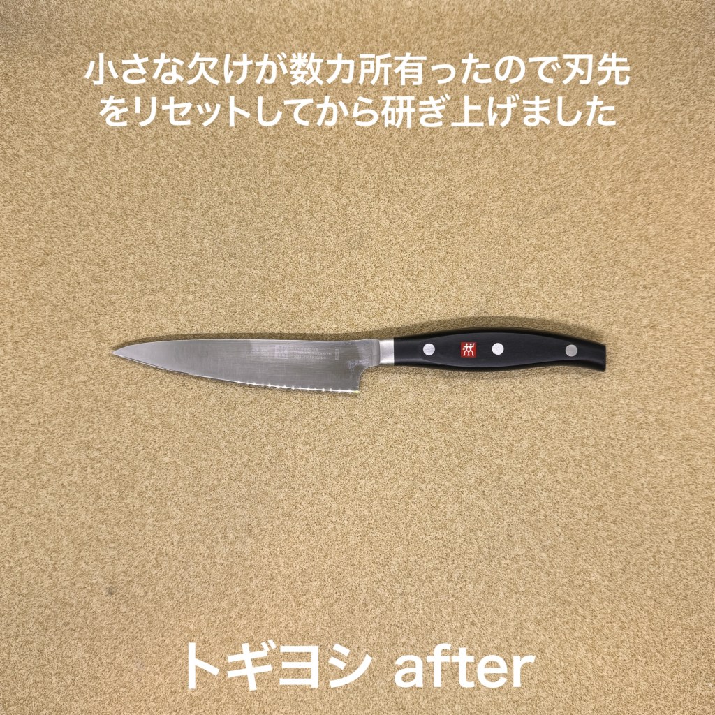 この2を研ぎ上げました。宮文の出刃庖丁は購入されてからの初研ぎになります。刃先には小さな欠けが複数あり、長い間頑張っていたのですね。刃先の欠けを落とし切刃を一から研ぎ直しました。ヘンケルスのペティナイフは中ぐらいの凹みが2、3箇所あり、刃先を多めに落として仕上げました。