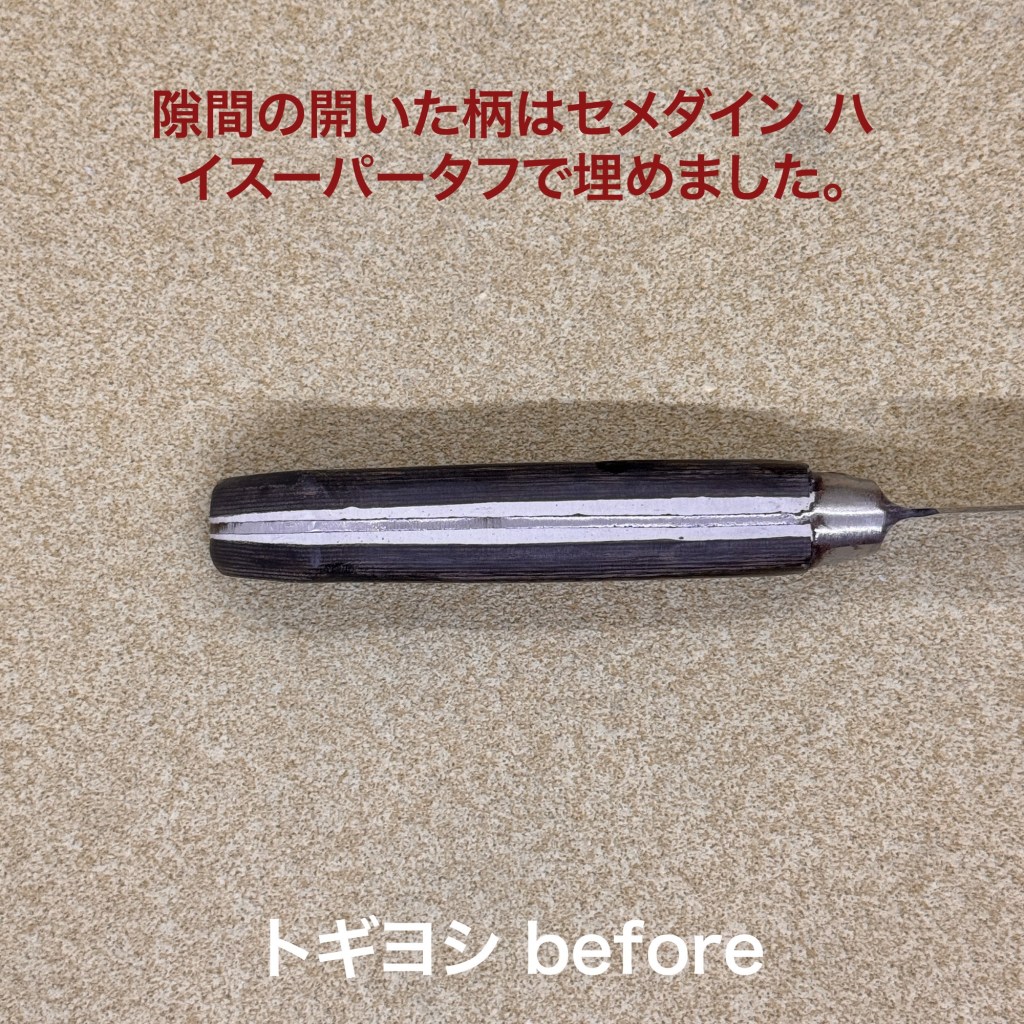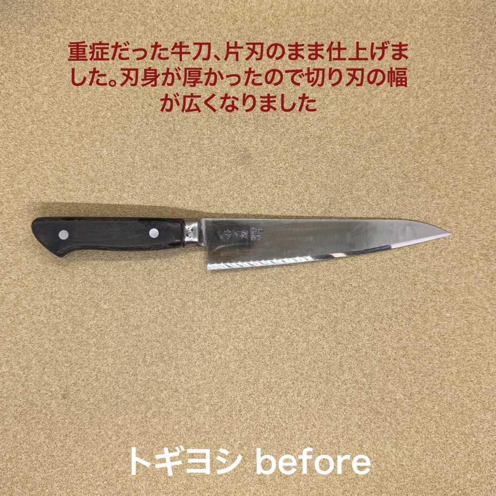 この1本を研ぎ上げました。源正守の牛刀、だいぶ使い込まれて、柄が開いてしまっています。この状態で研ぎますかとお聞きしたところ、了承を得られましたので研ぎ上げました。柄はセメダインのエポキシボンド ハイスーパータフで補修したところ良い感じで仕上がりました。刃の方は片刃のままで研ぎ、刃身が厚いので切り刃の幅が広がりました。