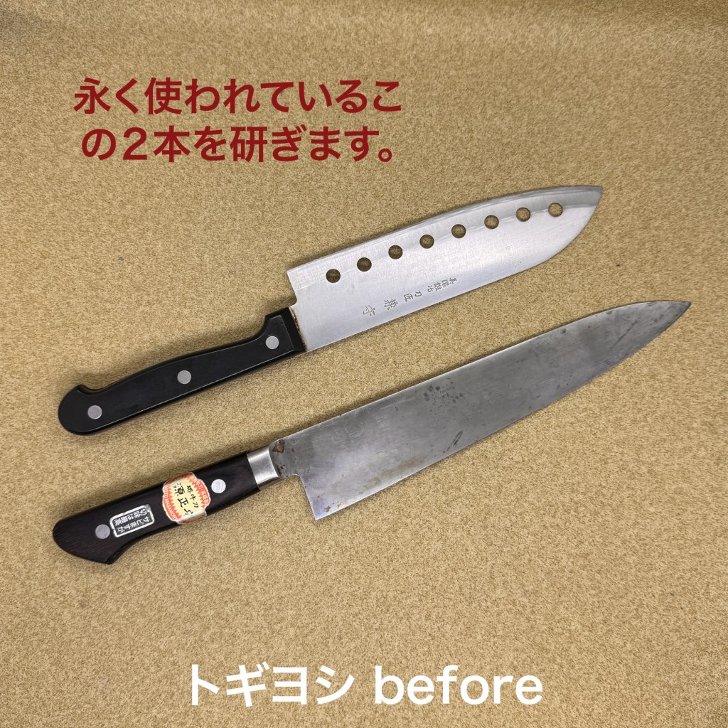 この2本を研ぎ上げました。どちらも永く使われている包丁達、兼守の穴開きタイプの三徳包丁は所々欠け?ステンレス特有の錆穴?どちらか区別は出来ませんでしたが整えて仕上げました。源正守の牛刀は鋼製なのでどうしても黒ずみます。片刃に研がれていて、刃先も所々欠けがあり整え、1000晩御飯の耐水ペーパーで磨いて仕上げました。