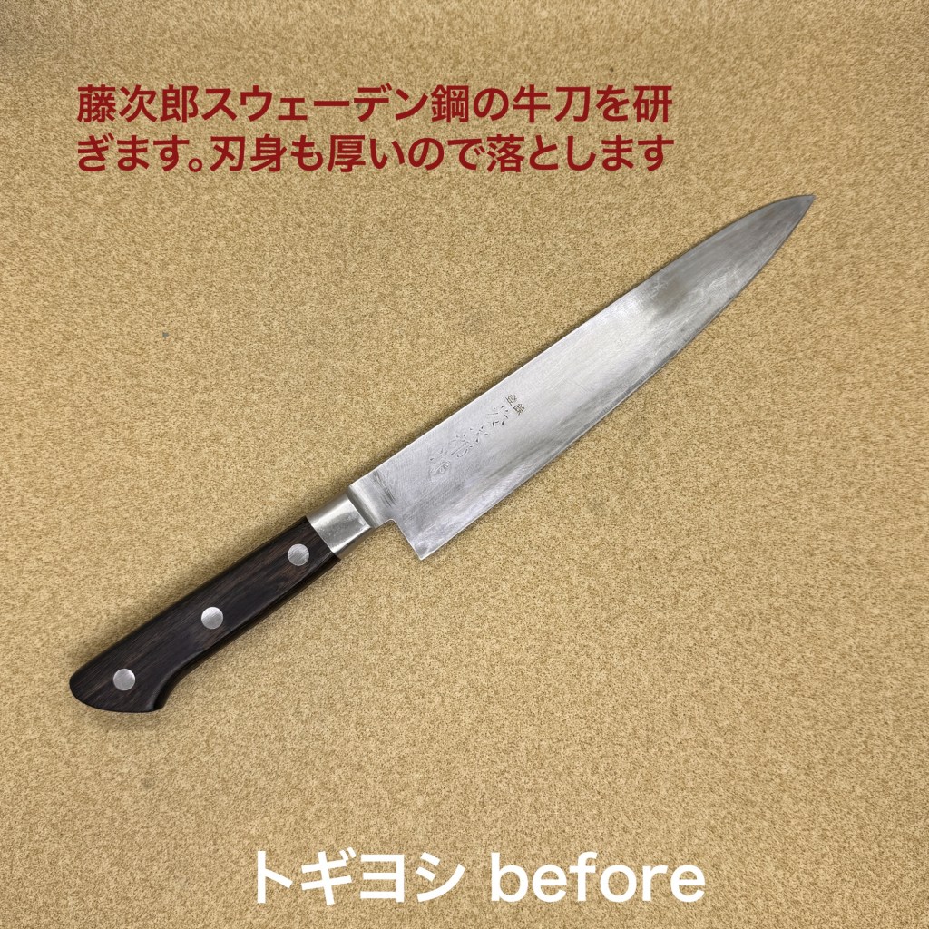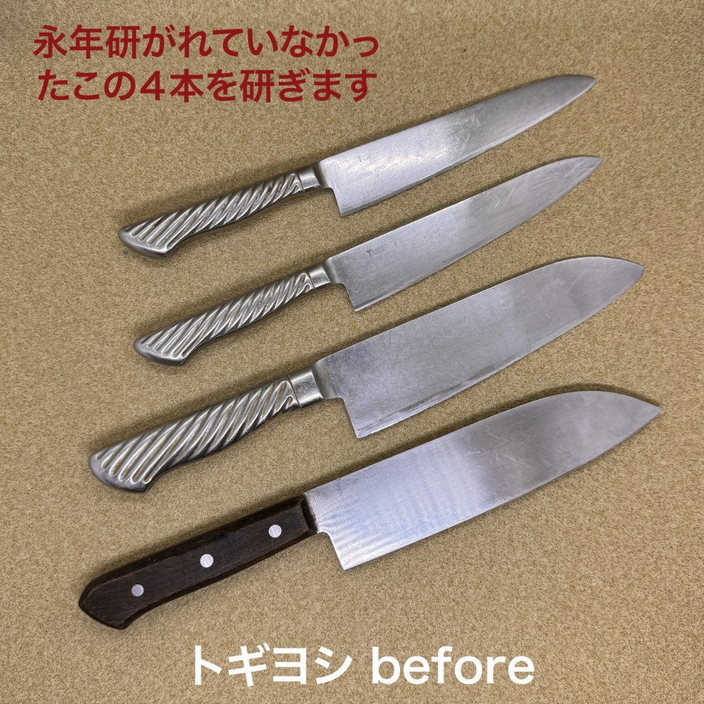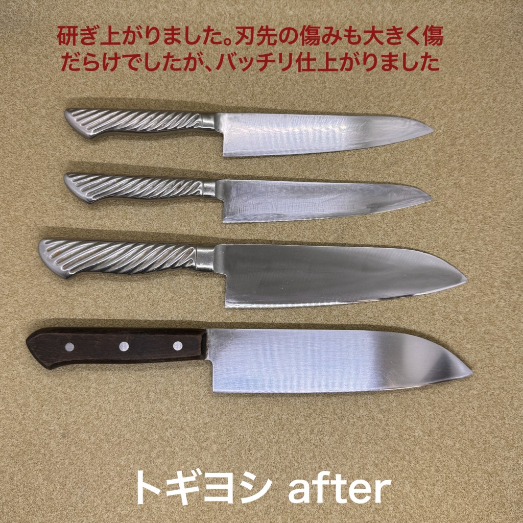 この5本を研ぎ上げました。ステンレス柄のペティと三徳包丁はタッパーウエアの包丁、刃先の傷みは結構すごくて荒砥でリセットし、胴も傷だらけなので耐水ペーパーで磨きました。木柄の三徳包丁はヘンケルス製、こちらも刃先の傷みはすごくてだいぶ落としてから仕上げました。藤次郎スウェーデン講師の牛刀は永年使っていて切れなくなったので切れるようになりますかとのご相談。はい良い素材包丁なのでバッチリ復活しますとお伝えしました。スウェーデン鋼は気持ちよく研げますね。バッチリ仕上がりました。