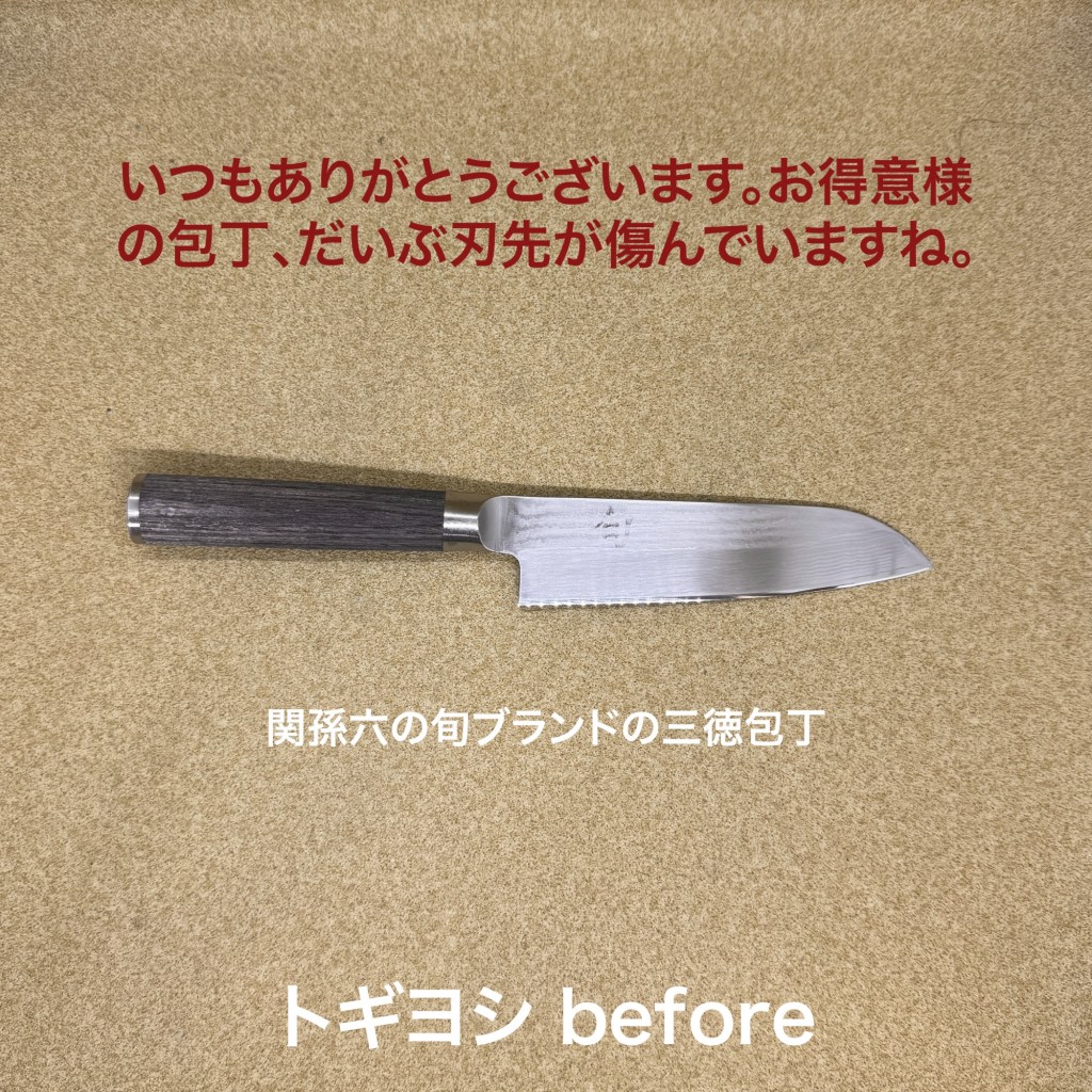 この1本を研ぎ上げました。お得意様の庖丁、いつもありがとうございます。関孫六の旬ブランド三徳包丁。刃の長さが145ミリと小ぶりです。元々は食材が張り付かないように凹みが有ったのですが、研ぎ進んで刃身が厚くなったので、何度か薄くする作業で消えてしまいました。刃先の方は細かい欠けが散見されましたので荒砥で落としてから仕上げました。