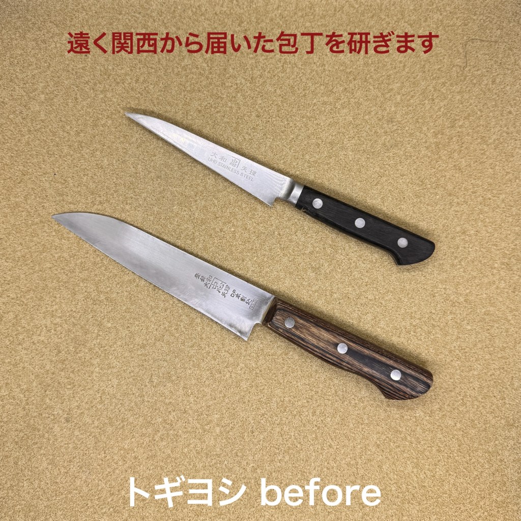 この2本を研ぎ上げました。昔々インターネットの前に存在したパソコン通信時代の友人から研ぎのご依頼を頂きました。ありがとうございます。奈良県天理市の弓仲金物店ブランドの包丁。初めて研ぐブランドです。だいぶ研ぎ進んでいて、どちらも刃の真ん中が凹んでいる鷲鼻状態と片刃でした。まず刃先の形状を整えてから大幅に刃身を削りました。なので幅広の切刃が見えると思います、そこから刃先を研いで仕上げました。