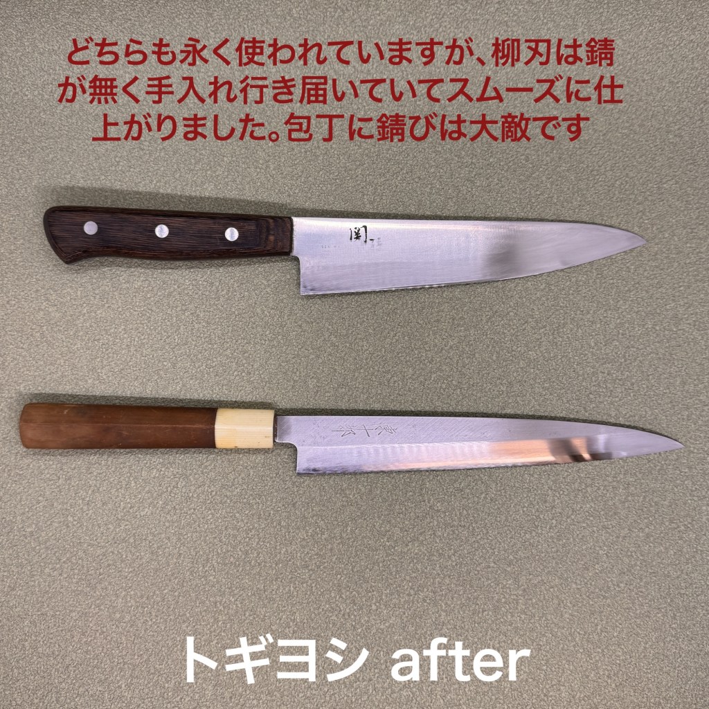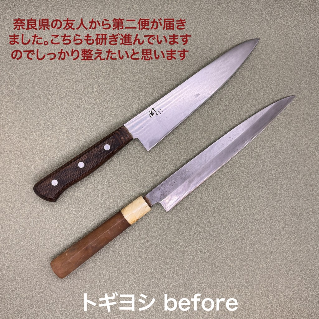 この2本を研ぎ上げました。奈良県の友人から第二便が届きました。どちらも永く使われていますね。関孫六の牛刀は研ぎ進んでいて、前回同様刃身が厚いので薄くする事から始め、ある程度整ってから刃を付けました。柳刃は鋼ですが錆が一切無く手入れが行き届いているのが良く判ります。研ぎ師にはとっても嬉しいこと。切り刃がフラットでは無かったのでそこから修正し、磨いてから仕上げました。どちらもバッチリ仕上がりましたよ。