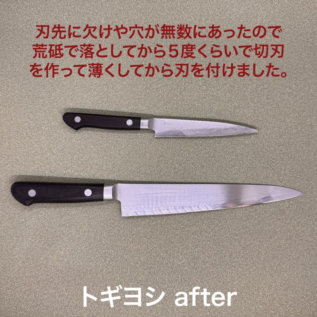 ミソノのペティと牛刀はだいぶ研ぎ進んで刃幅が狭くなって刃身も厚くなっていますので、まずは薄くしてするのと、刃先には欠けや穴が多いので刃先を落としてから研ぎ上げました。宮文の三徳包丁は新品に近い刃幅が残っている状態なので刃身は気にしなくて良い状態。ただ刃先は欠けが多いため荒砥で落としてから研ぎ上げました。