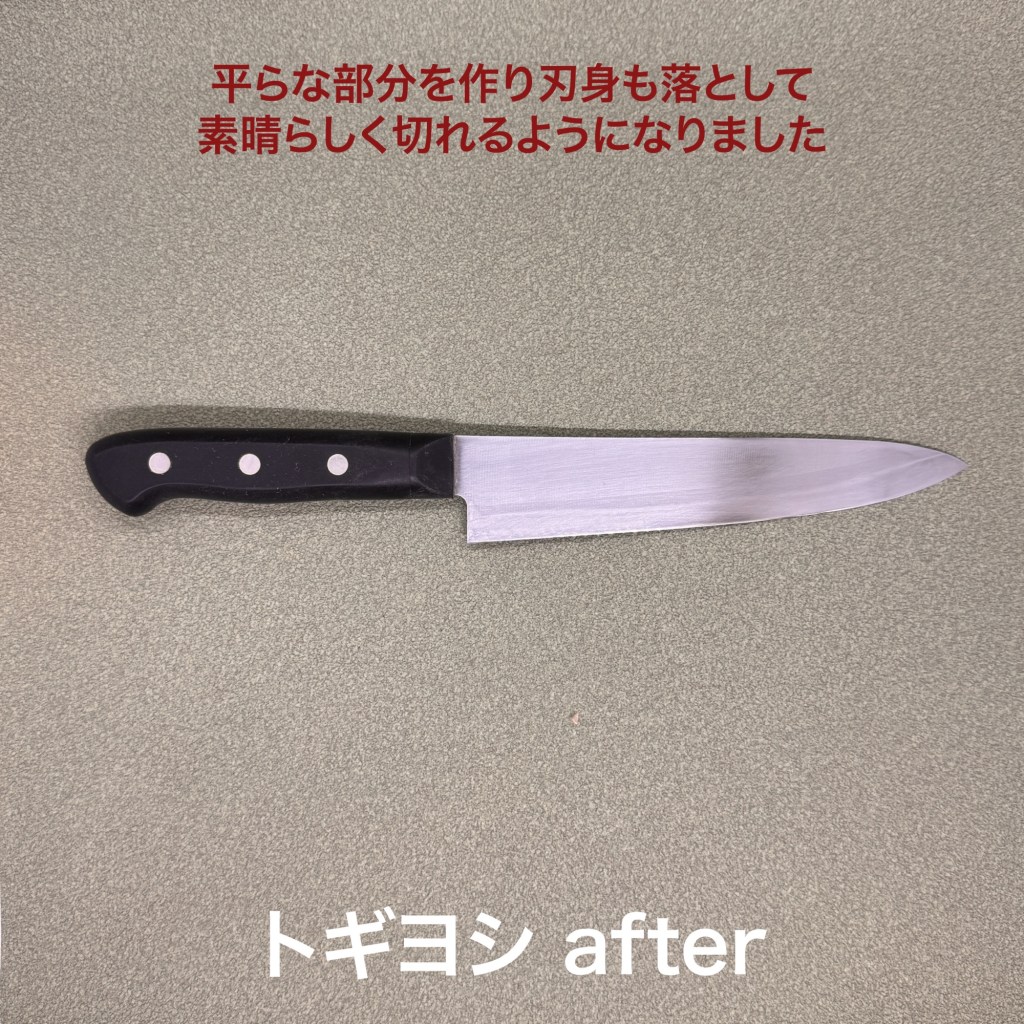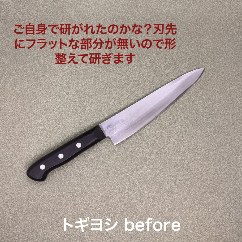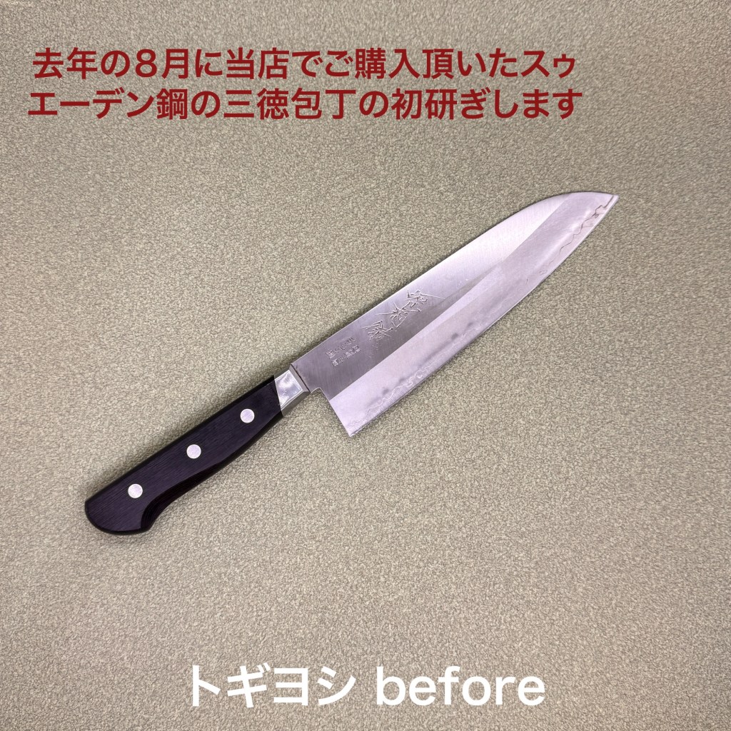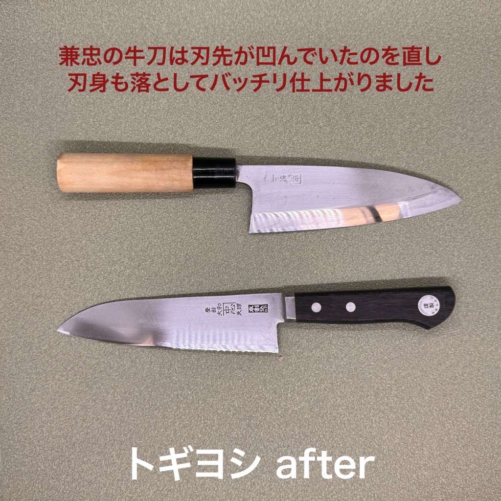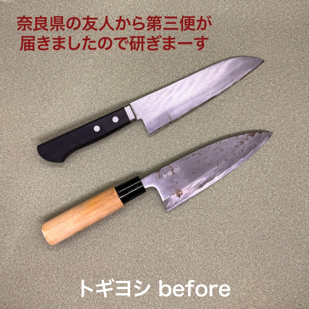 この4本を研ぎ上げました。源虎徹の三徳包丁は当店で以前販売したもの。初研ぎサービス券をご利用頂きました。約半年使った状態で刃先はそこそこ傷んでいましたが中砥で十分対応出来るくらいでした。やっぱりスウェーデン鋼は硬くて仕上がりが良いですね。次は刃先がゆーるくカーブした牛刀は初めてのお客様。まず刃先を使いやすい形に削りその分刃身が厚くなるので落としてから仕上げました。奈良県の友人から第三便が届きました。ありがとうございます。今回は牛刀と出刃庖丁。出刃は研いだ形跡がありますのでいちから切刃を付け直して仕上げ、牛刀は手前の刃先が下がっていたので整えた後刃身を落としてから仕上げました。
