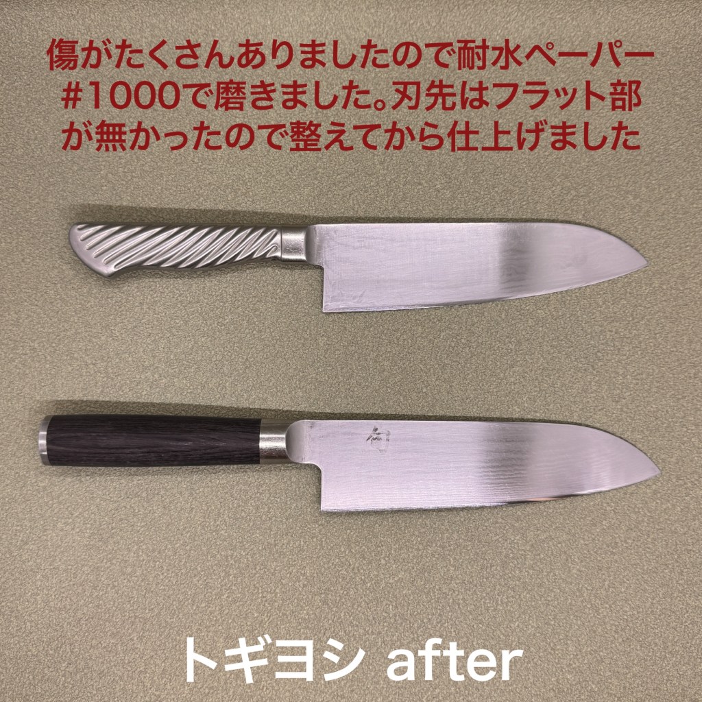 この2本を研ぎ上げました。どちらも三徳包丁。全面に傷が多く耐水ペーパー1000番で磨くと綺麗になります。磨く時は平らな所に置いて磨いて下さいね。刃先は緩くカーブしていて包丁を下ろしただけでは食材がつながってしまう状態なので荒砥でフラットに戻してからトギヨシ上げました。