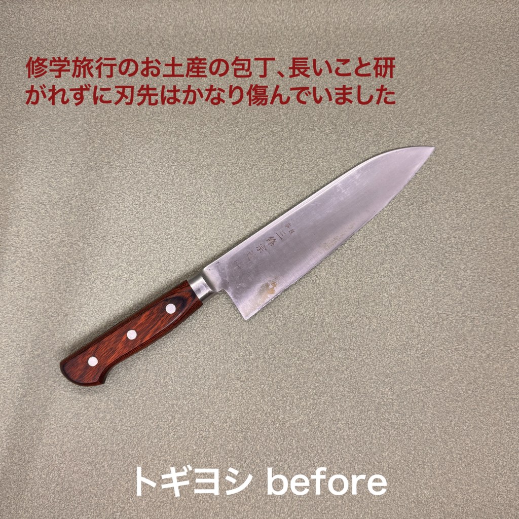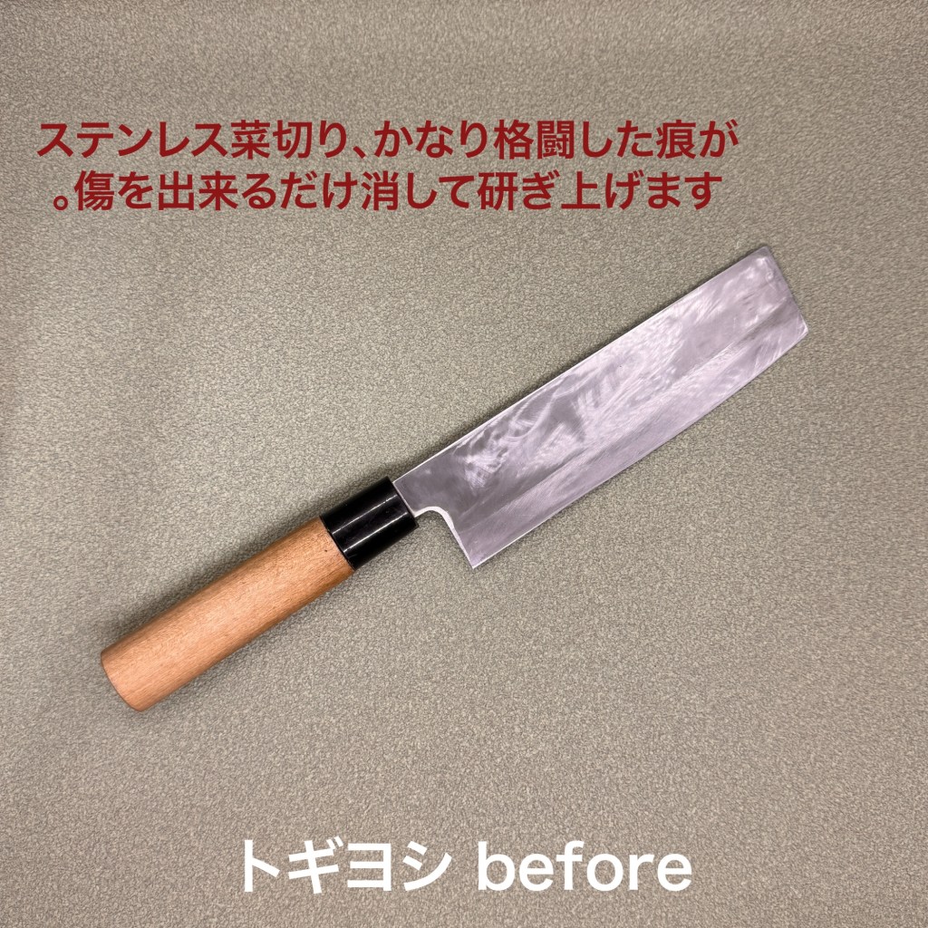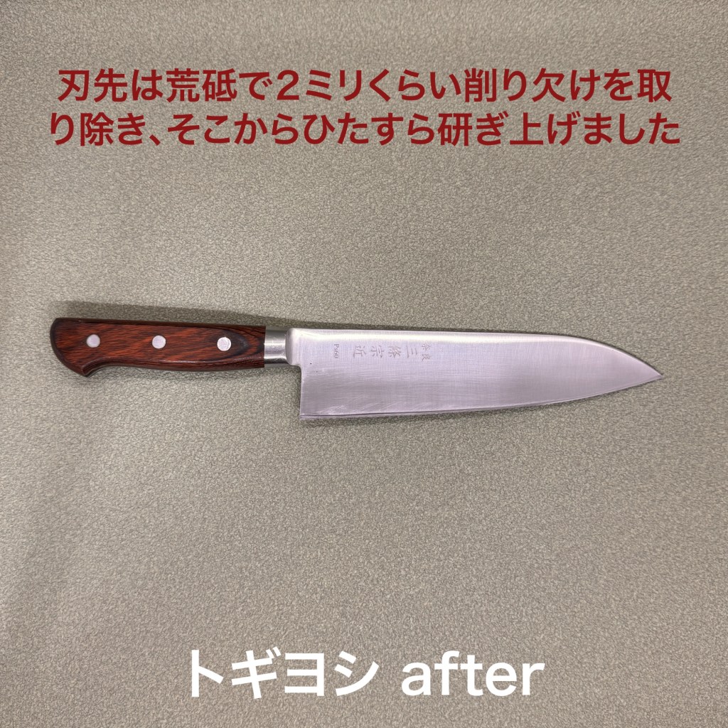 この2本を研ぎ上げました。菜切り包丁は全面に傷が多くかなり格闘した痕が無数にあり耐水ペーパー1000番で磨いてだいぶ綺麗になりました。研ぎ進んで刃身が厚くなっていたのを直してから刃を付け直しました。三條宗近の三徳包丁は修学旅行のお土産。コレまで研いで10本に1本はお土産包丁かもしれません。状態は刃先に大きめの欠けが数カ所あり直せますか?と心配していたようですが全く問題ありません、荒砥で落としてバッチリ仕上がりました。