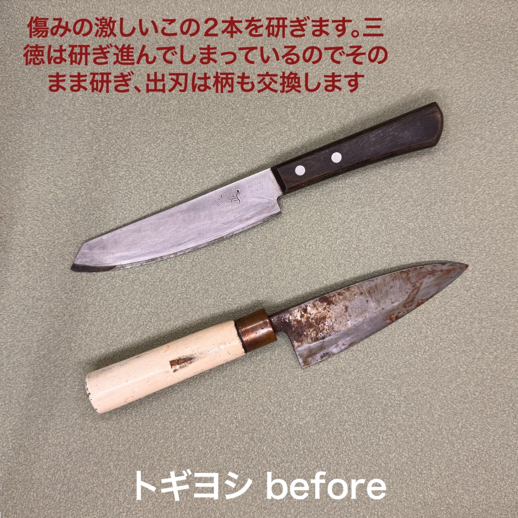 この2本を研ぎ上げました。三徳包丁は新品の幅の半分くらいまで研ぎ進んでしまっています。形を整えたくても刃幅が足りないため、形はそのままで仕上げることに、刃身も厚いのでかなり落としました。出刃包丁はかなり錆びていましたがそれほど深くはなく、裏も真っ平に研がれてしまっていたので、裏スキを作り直し仕上げました。