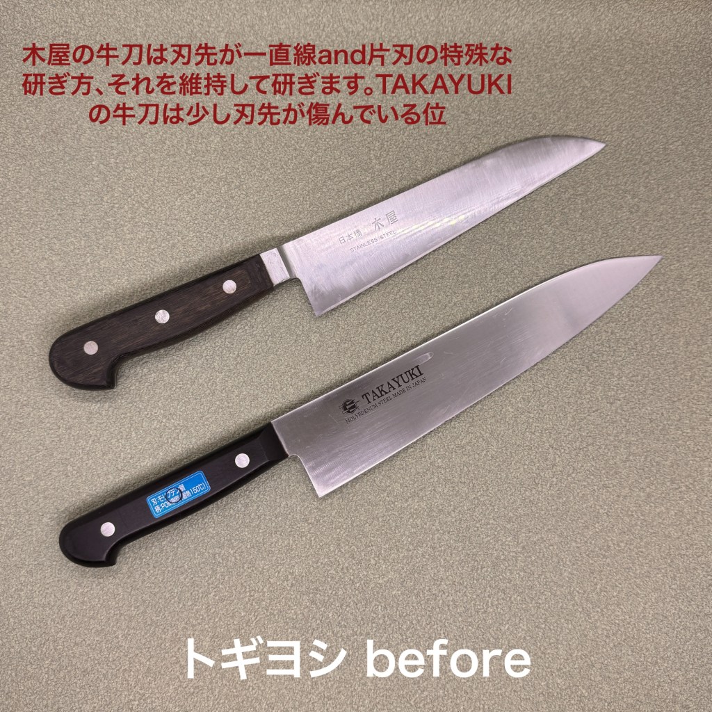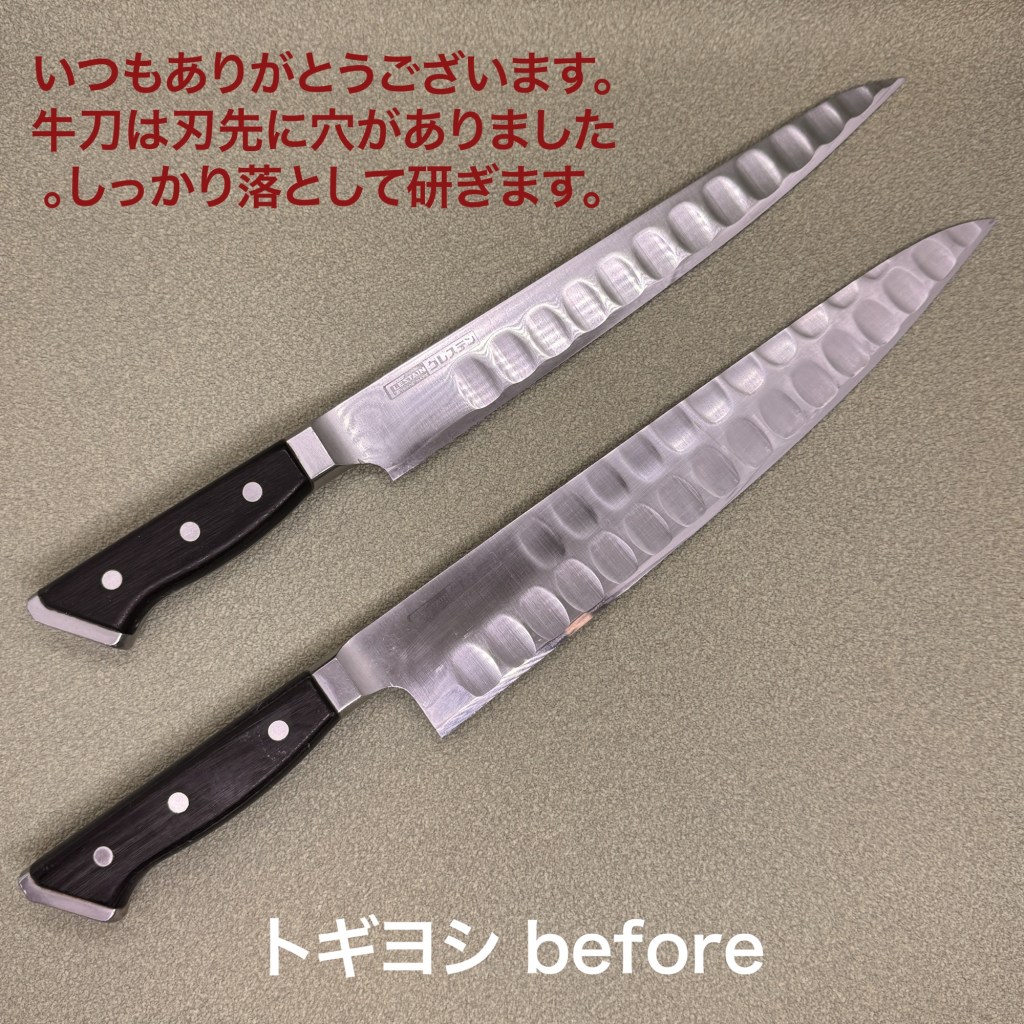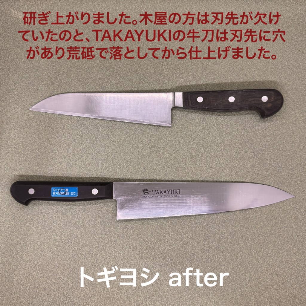 この4本と自家用包丁5本も研ぎました。木屋の牛刀は刃先が一直線で左利きの向きで片刃研ぎになっています。近い形は骨スキ包丁ですが厚さは牛刀ですので不思議な研ぎ方になっている包丁です。研ぎとしてはそのままの形を維持して研ぎました。片刃の向きが反対なので、研ぐ時違和感が抜けず苦労しましたがなんとか仕上がりました。TAKAYUKIの牛刀は210ミリの大きめタイプ、実はこのくらいの長さがオススメです。プロの料理人が使う技の先端をまな板に置きながらテコ切り(勝手に命名)がやり易くなります。刃先の方は穴が数カ所あり一旦リセットしてから仕上げました。大きな包丁は麺屋武双さんの包丁、いつもありがとうございます。刃先に穴が数カ所ありましたので荒砥で落として整えてから仕上げました。写真はありませんが月初めなので我が家の包丁達も研ぎました。