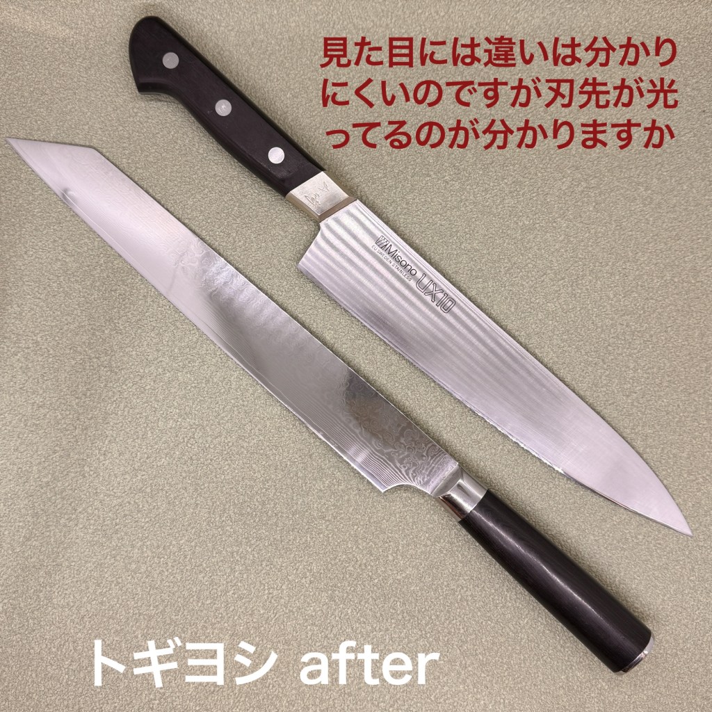 この2本を研ぎ上げました。リピートのお客様ありがとうございます。ミソノのUX10はステンレスの中でもかなり硬い材質、とても切れ味が良く仕上がります。刃先に小さな欠けというか穴があったので落として整えてから研ぎ上げました。もう一本はブランドが不明ですがキレイなダマスカスの筋引き包丁、こちらも硬度が高く砥石の上で滑るような感覚でした。仕上がりは最高です♪