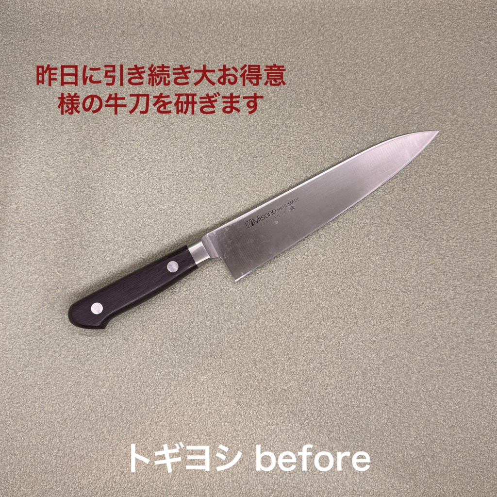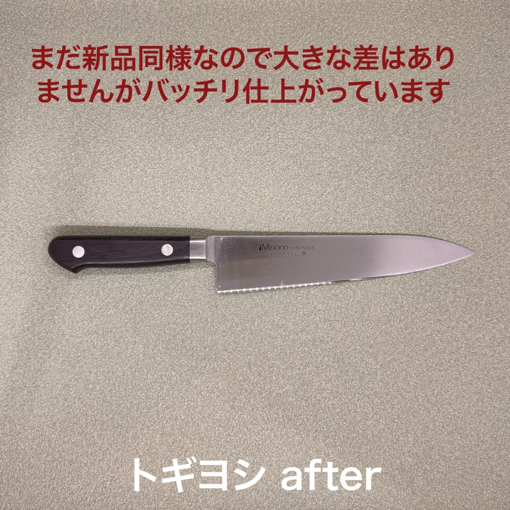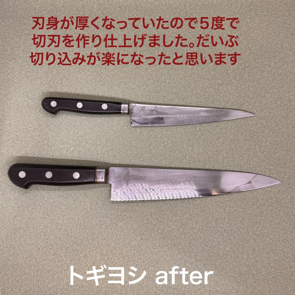 この5本を研ぎ上げました。マサズミの2本は20年以上使われている包丁、どちらも片刃になっています。研ぎ進んで刃身がかなり厚くなっていたので、まず5度で切刃を作り直してから仕上げました。牛刀は柄が錆びで浮いていますのでセメダインスーパータフで埋めました。もう替え時だと思いますが使い心地が良いので変えられないと仰っていました。ミソノの牛刀はお得様に購入して頂いた包丁でまだまだ新品同様です。バッチリ仕上がっています。堺兼近の舟行きは錆びが少し進んでいますが磨いたら綺麗になりました。刃先は片刃に研がれていますのでそのままで仕上げました。千鳥の牛刀は刃先は形が崩れて大きくカーブしています。コレでは食材が繋がってしまうのでガッチリ削って再構築しました。だいぶ変わったでしょ!