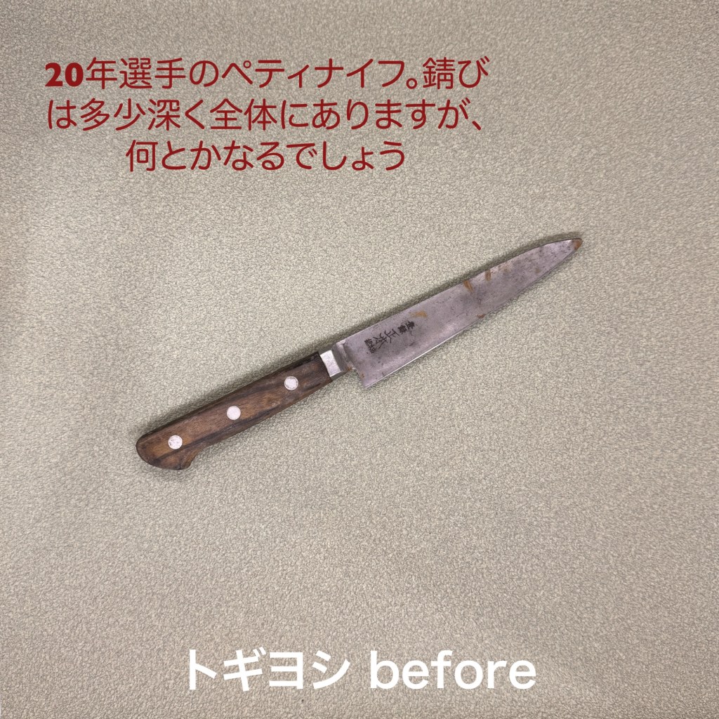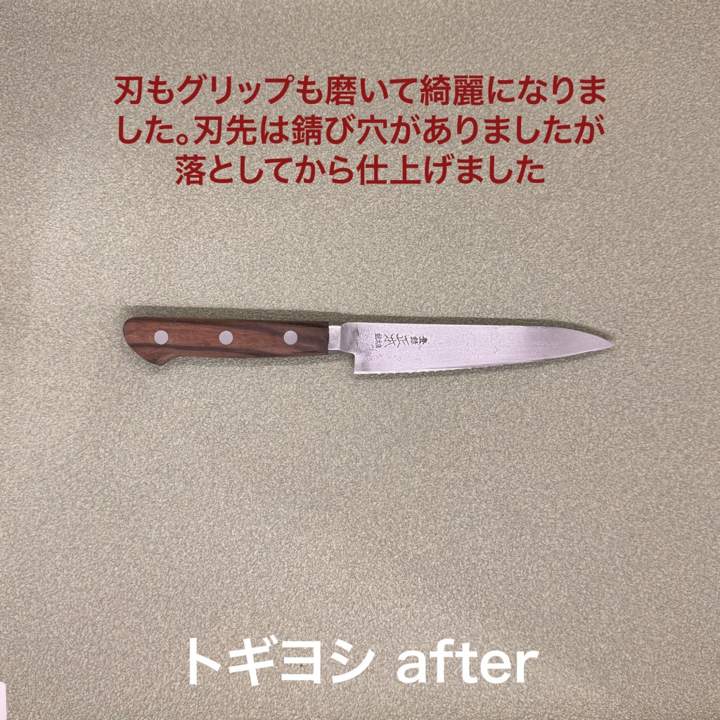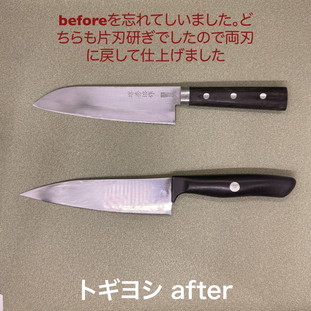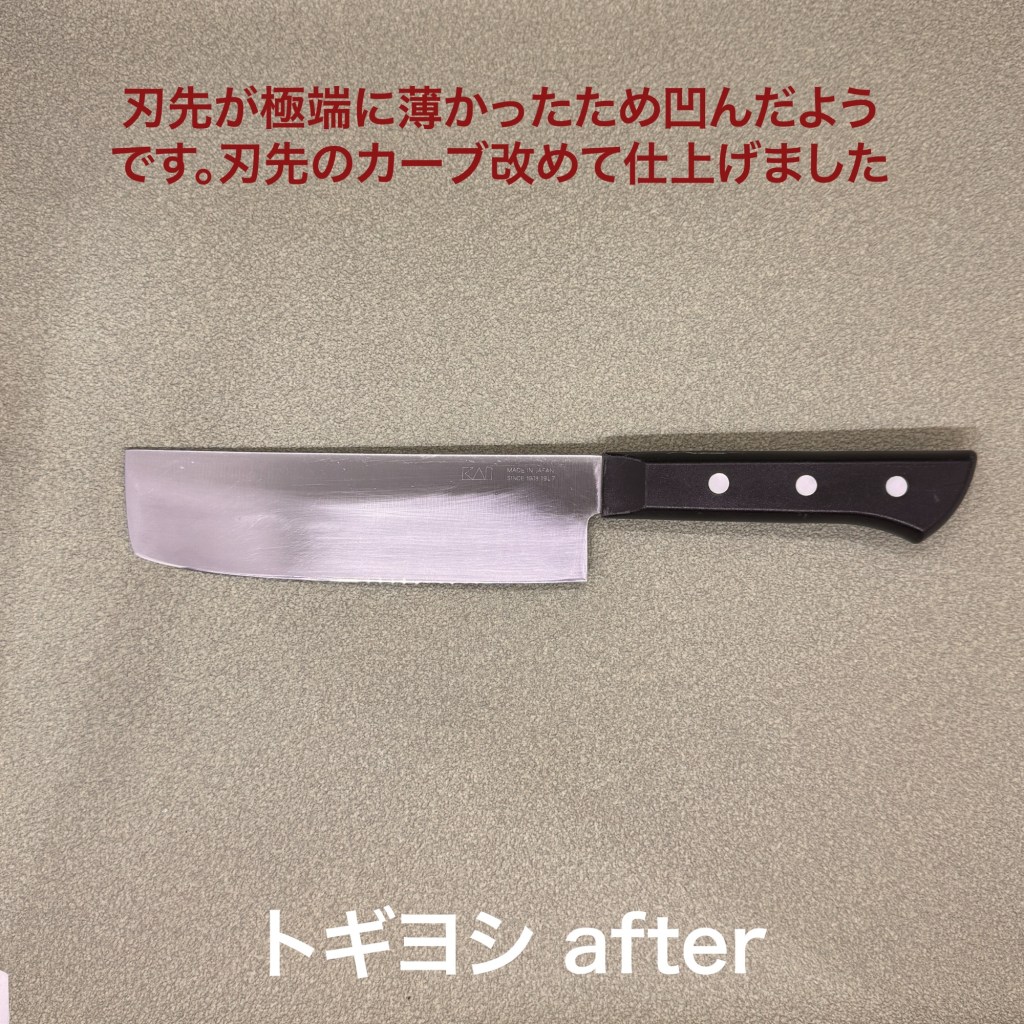 この4本を研ぎ上げました。札幌からありがとうございます。かなり薄く研がれていて硬いもの切ってしまい刃先が凹んでいました。菜切りはその字の通り野菜専用の包丁です。硬いものは切らないで下さいね。正本のペティは20年選手。ご結婚の際に購入したそうです。余り研がれていなかったようで刃先は余り減っていないのでその点は良かったです。鋼の錆を落としグリップ部も汚れが溜まっていたので磨いて綺麗になりました。まだまだ活躍できますね。堺秀治作の三徳包丁は鋼が硬いですね、研いでいる感覚が薄くて研ぎ上げられるのかと思いました。その分仕上がりは最高。ヘンケンルスのシェフナイフは片面だけ研いだ痕跡があり両刃戻して仕上げました。